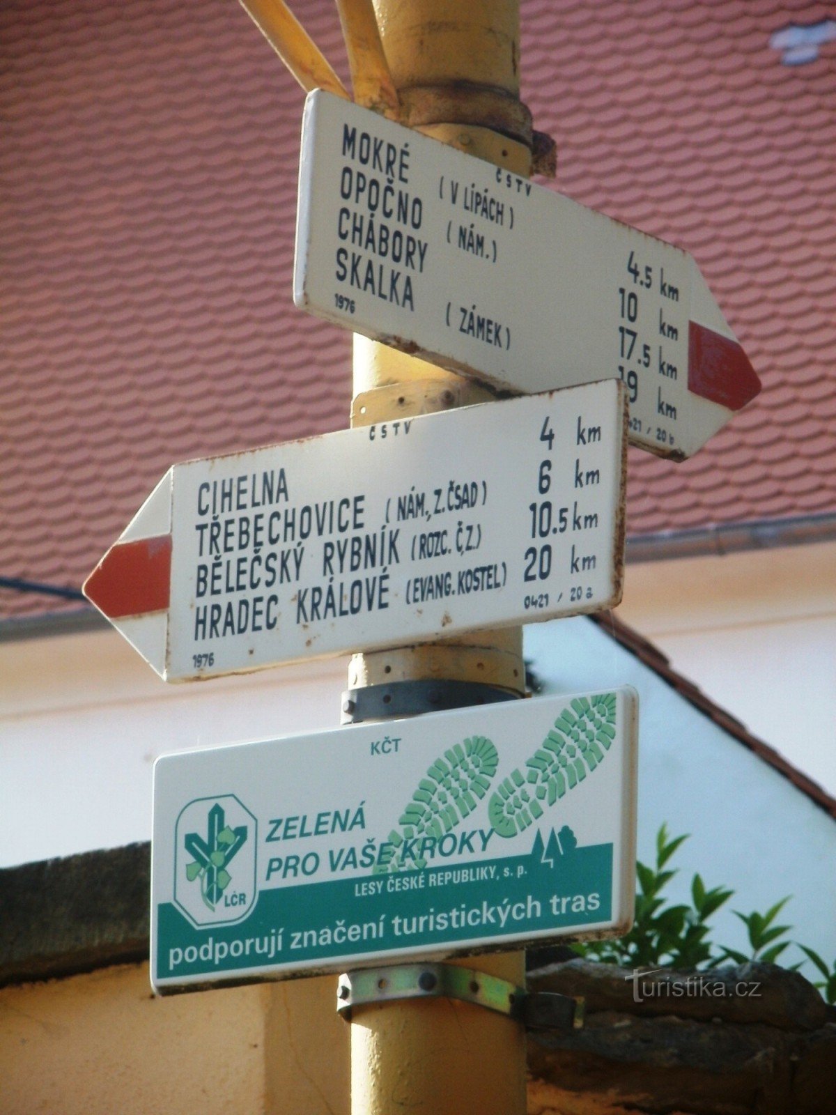 Turistický rozcestník, který se nachází u kostela sv. Jakuba, ukazuje turistům cestu po červené značce ve směru Hradec Králové, Běleč, Třebechovice pod Orebem - Opočno, Podbřezí, Prázova bouda.
