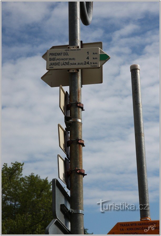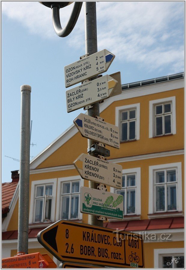 Turistický rozcestník najdeme v jižní části Rýchorského náměstí v Žacléři. Vycházejí od něho tyto značené trasy: