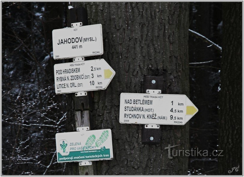 Turistický rozcestník je umístěn na okraji obce Jahodov. Prochází tudy tato turisticky značená trasa: