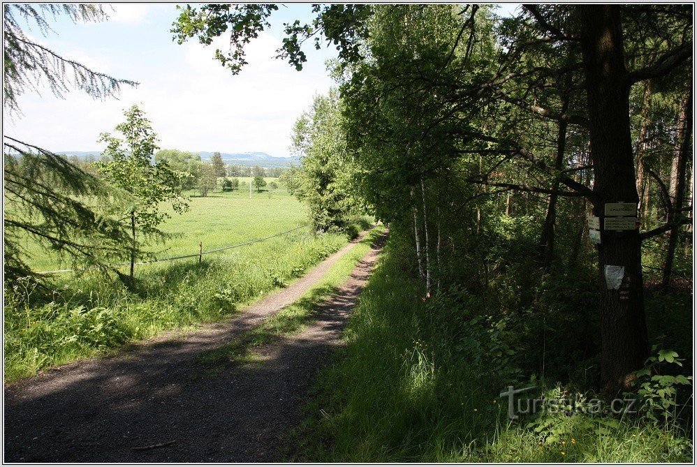 Směrníky tohoto rozcestí ukazují průběh červeně značené trasy ze Dvora Králové nad Labem, Horního Dehtova, Miletína a Rohoznice na Vřešťovský chlum, pod Doubravu a do Hořic v Podkrkonoší.