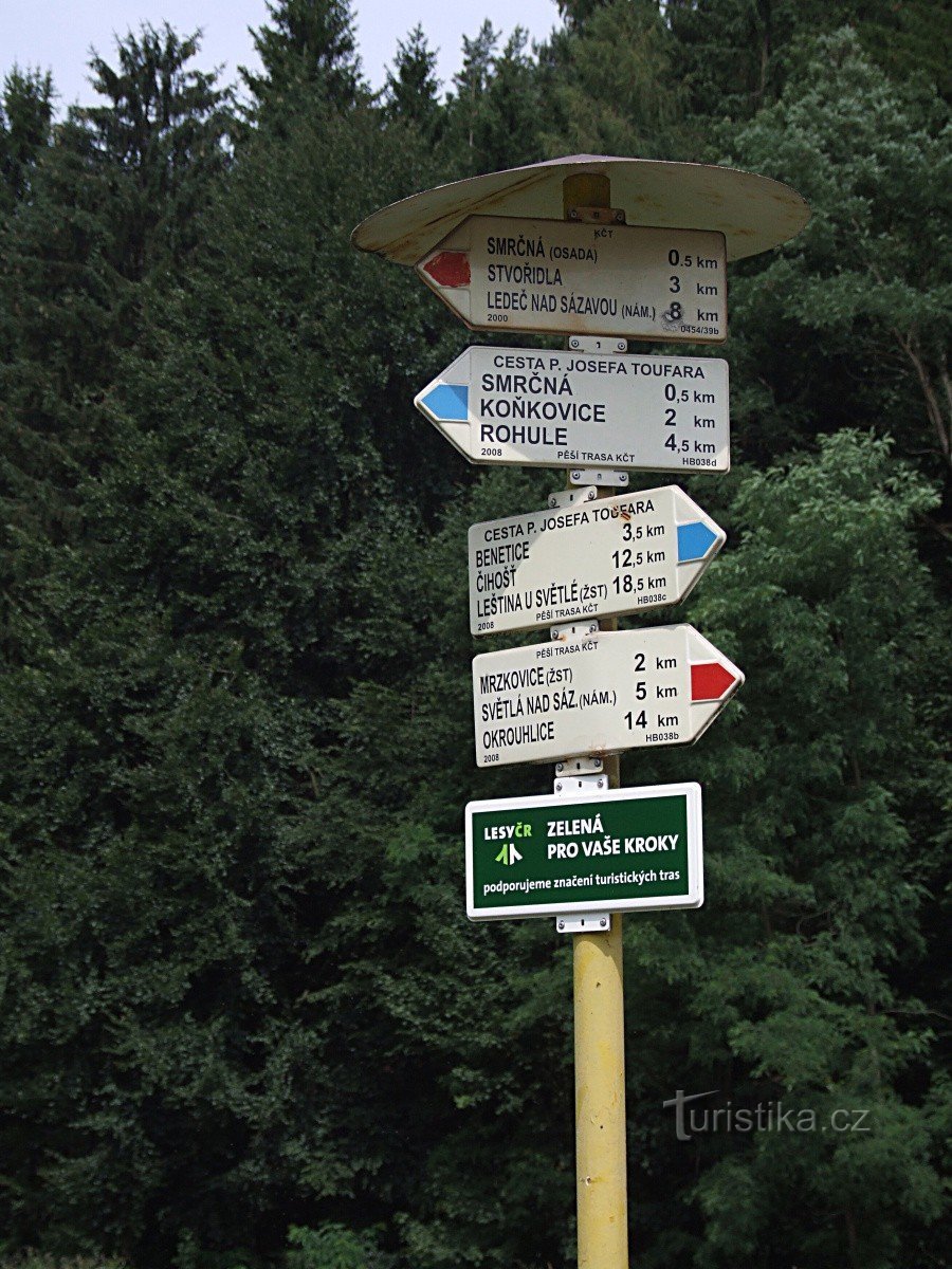Pro turisty vystupující z vlaku ve stanici Smrčná na trase Ledeč n.S. - Světlá n.S. je přímo u železniční zastávky umístěný rozcestník, jehož šipky ukazují směr červené a modré turistické značky. Obě trasy okolo zastávky procházejí společně, a to v úseku dlouhém asi 500 m. Červená značka, která po celé své délce kopíruje údolí řeky Sázavy sem přichází od východu přes Světlou nad Sázavou od…
