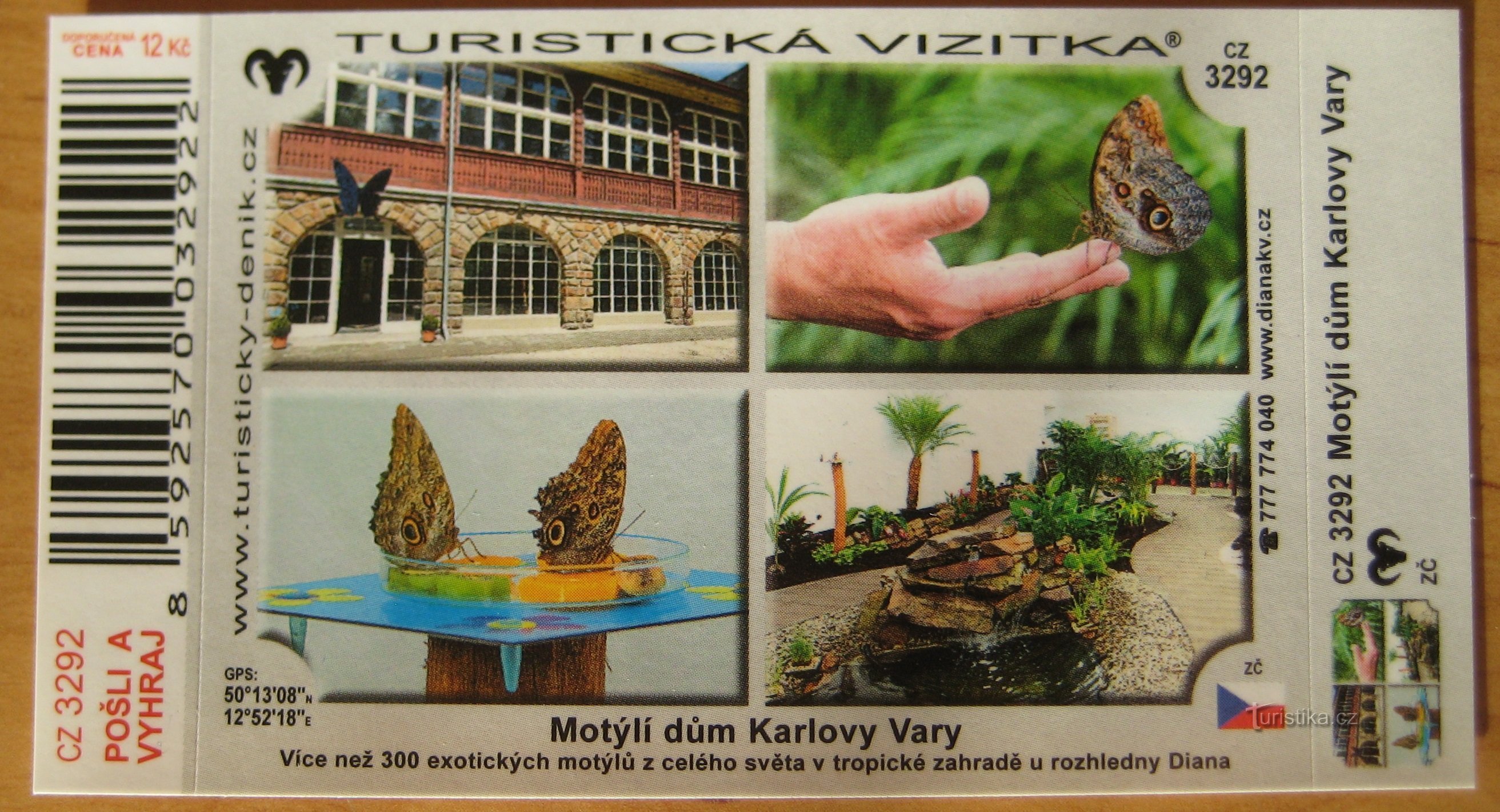 Turistická známka č. 2230 - Motýlí dům, lze zakoupit v Motýlím domě v Karlových Varech v areálu rozhledny Diana... Dále lze zde zakoupit TV č. CZ 3292A zjískat tyto razitka - viz. fotoDoporučujeme: 360° video - Motýlí dům ve virtuální realitě na VRČesko.cz
