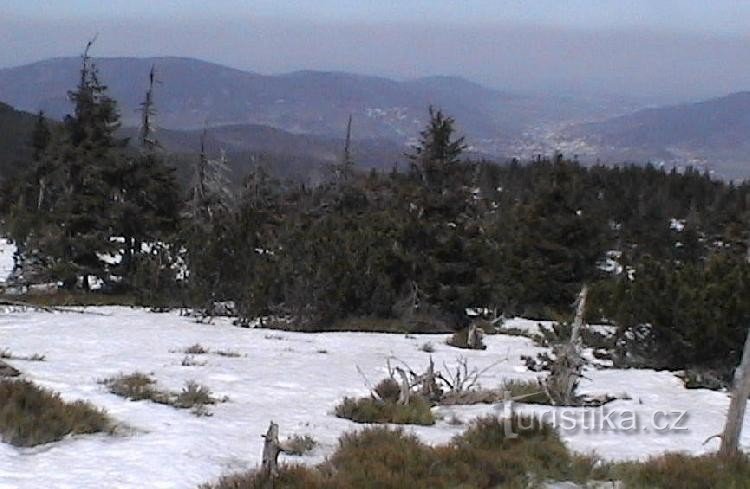 Rozcestí zelené a žluté turistické značky se nachází pod horou Točník v CHKO Jeseníky.