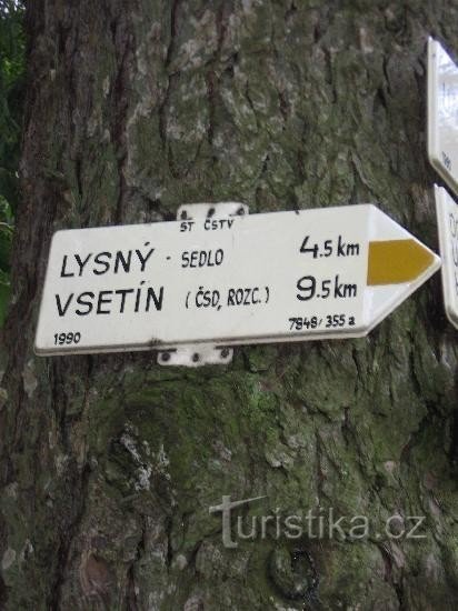 Rozcestník červené a žluté turistické značky severovýchodně od Vsetína. V blízkosti místo dalekého Rozhledu.