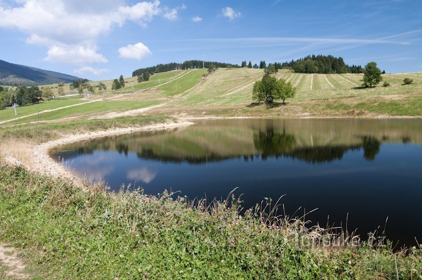 Že leckdy i zcela účelová stavba může působit malebně dokazuje zasněžovací rybníček v Hynčicích pod Sušinou. Postavili si ho tu původně pro nalepšení stavu vody při zasněžování zdejšího rozsáhlého areálu. (Letos se moc neuplatnil). Jinak hlavní zasněžovací bazén najdeme u hospody v centru areálu. Rybníček má ovšem celoroční využití, jsou v něm nasazeny nějaké rybičky, tudíž za úplatu se tu dá…