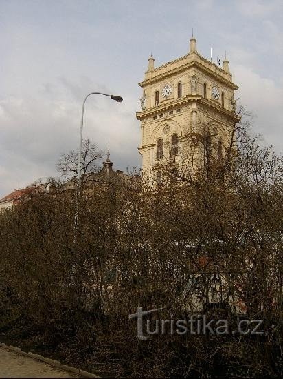 Novorenesanční pětipodlažní hranolová věžová budova byla postavena v roce 1882 podle plánu arch. A.Turka. V nejvyšším patře má vyhlídkovou terasu, která sloužila jako rozhledna. Nároží zdobí pylony se sochami troubících andělů, na atice jsou hodiny, pod nimi v Kruhových medailonech znaky Královských Vinohrad.. Na pásovou bosáž spodní části věže navazuje ve střední části arkádové pole, v horní…