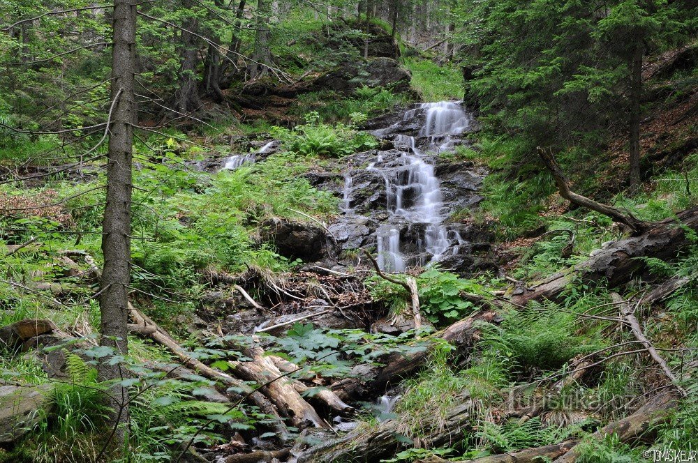 K málo známému, ale o to krásnějšímu vodopádu se dostaneme z Červenohorského sedla nebo z druhé strany od Koutů nad Desnou po žluté turistické značce. Značená trasa však k vodopádu nevede, proto z ní musíme přibližně v půli odbočit na nenápadnou cestu proti proudu Divokého potoka. Vodopád je od této odbočky vzdálený asi kilometr, během něhož potkáme na potočním toku několi peřejí a kaskád, včetně…