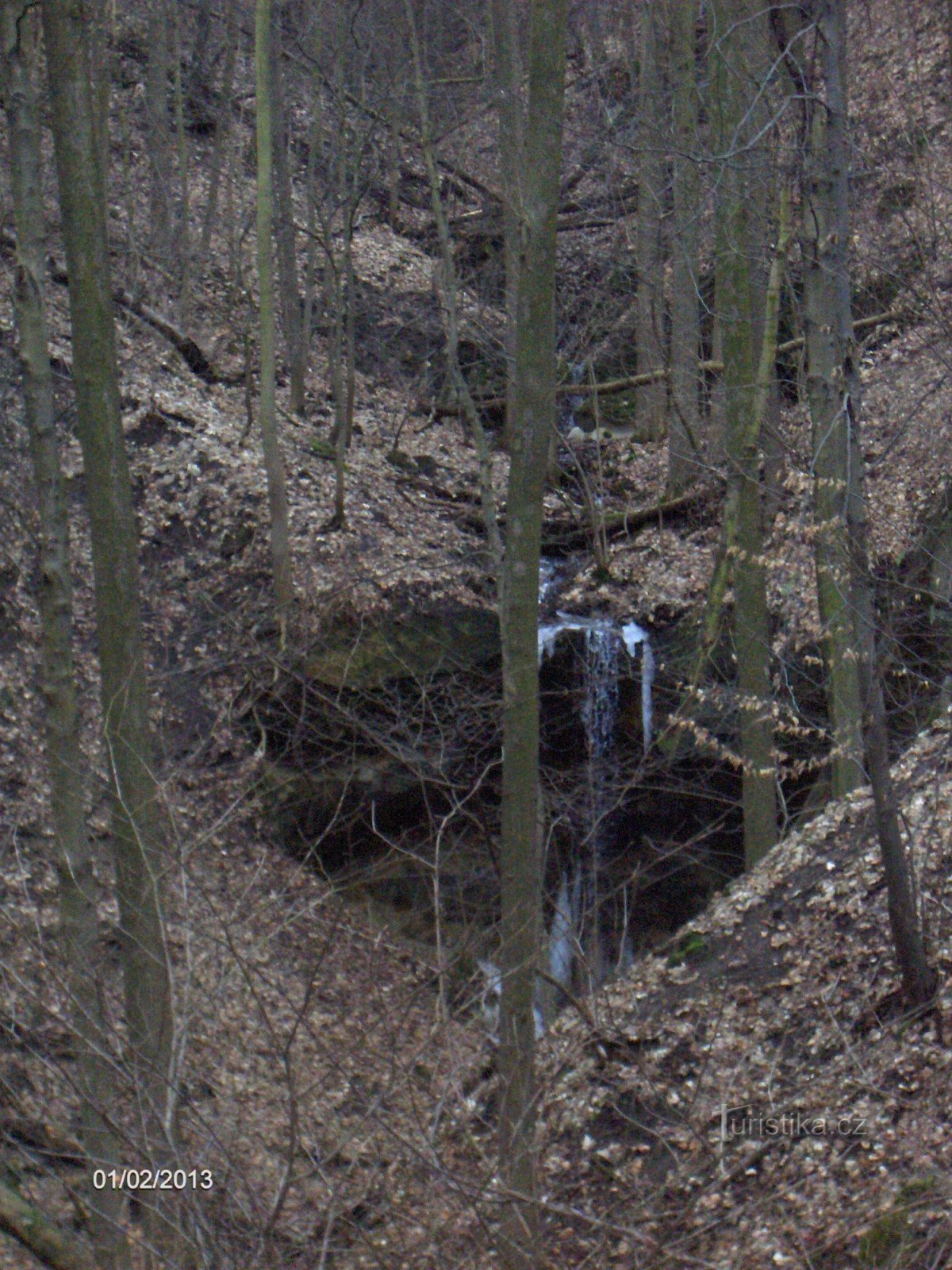 Výlet na zimní vodopády v blízkosti Ústí nad Labem. Od vlakové zastávky v Mojžíři vycházím po silnici okolo fotbalového hřiště až k můstku přes Kamenný potok. Jsem překvapen, že koryto potoka je úplně suché, přestože v posledních dnech se značně oteplilo. Je obleva, Labe se rozlévá a tady ani kapka. Přesto pokračuji dál cestou podle koryta. Až za posledními domy, na okraji lesa se objevuje slabý…