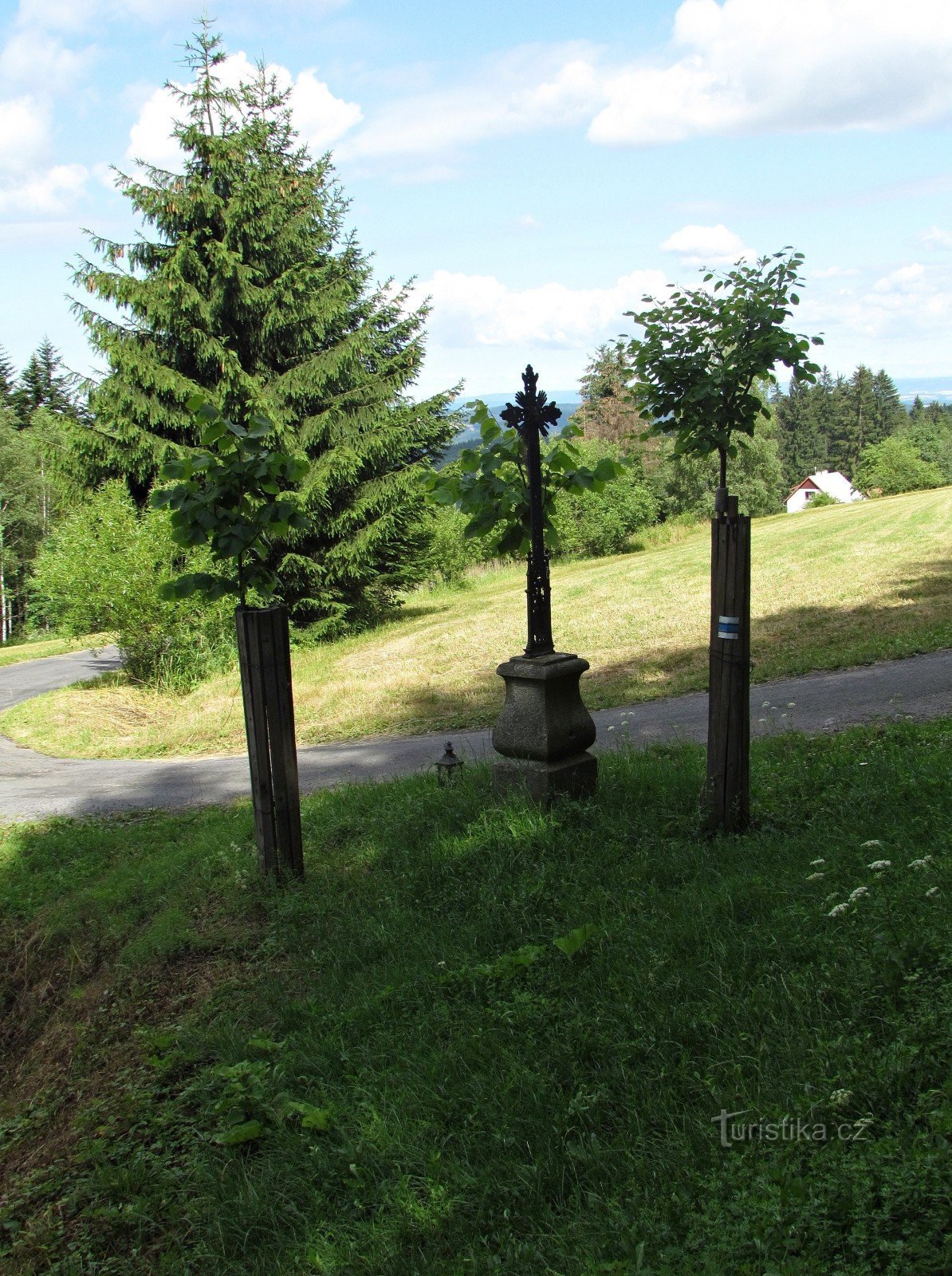 Z rozcestí na Dušné vede k přehradě Bystřičce nádherná vyhlídková cesta, takže je pochopitelně intenzivně využívána jak pěšími (modrá značka a značení NS Klenov), tak i cykloturisty. Nejhezčí panorámata se před vámi otevřou za kopcem Brdo (718 m), jehož vrcholové temeno silnička obchází úbočím, ale za ním se vyšplhá na vlastní hřeben. Pak přijde rozcestí, na němž je umístěn starý litinový…
