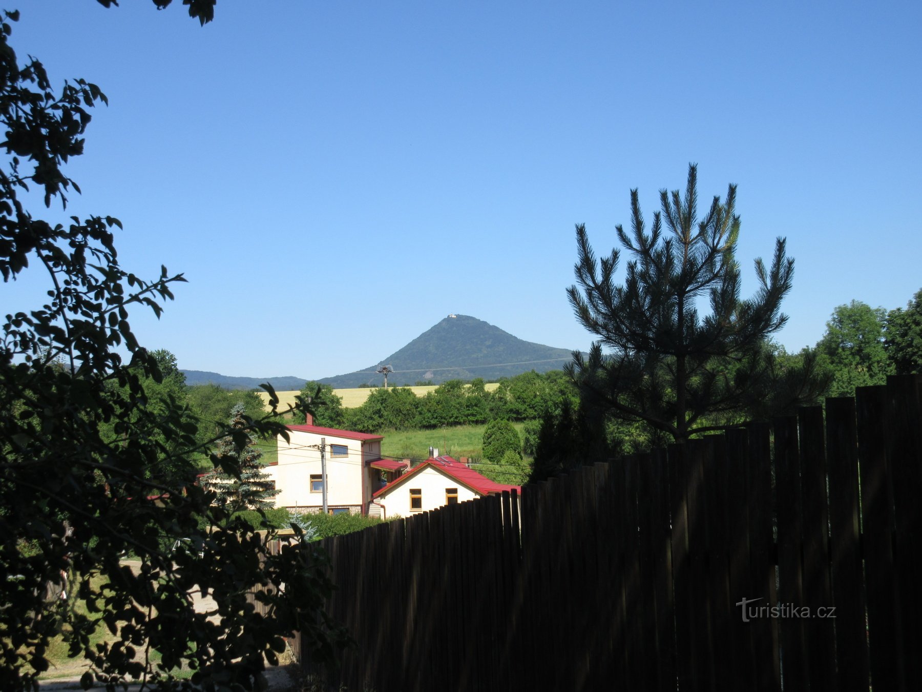 Když už jsme byli v Oparně a máme rádi vyhlídky, tak jsme samozřejmě museli vyrazit i na Lovoš (570 m.n.m.). Ten je spolu s Milešovkou (837 m.n.m.) dominantou této části Českého středohoří. Milešovka je samozřejmě nejvyšší vrchol, ale i téměř pravidelný kužel Lovoše je všude vidět. Při pohledu od jihu je vpravo vidět ještě jeden nižší kopec, zvaný Malý Lovoš nebo též Kybička (489 m.n.m.)