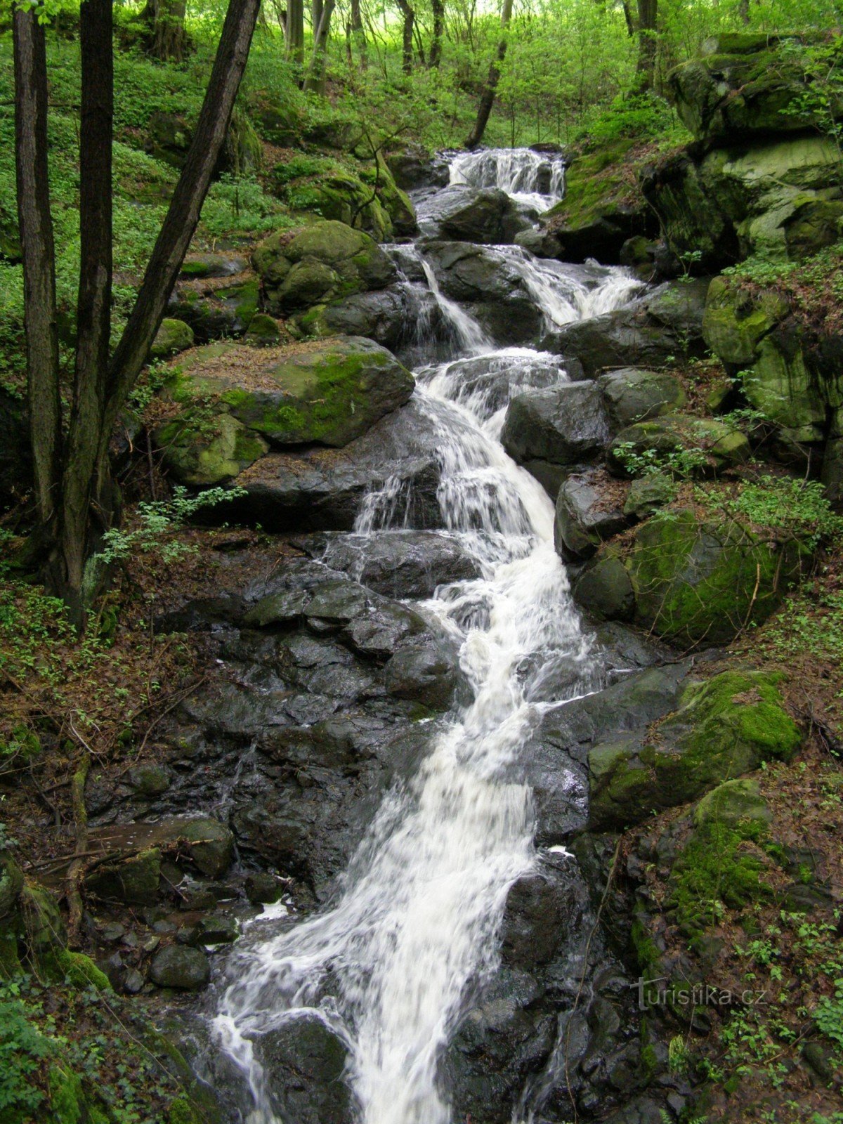 Z Dolních Zálezel začínáme stoupat po zelené nad obec, na křižovatce turistických tras zelenou opustíme a jdeme modře značenou naučnou stezkou proti toku Moravanského potoka. Značky naučné stezky končí u menšího vodopádu, pěšina však pokračuje dále a tak ještě kousek pokračujeme k dalšímu kaskádovitému vodopádu. Pěšina uhýbá vlevo a po cca 400 metrech chůze přijdeme na zelenou značku a…