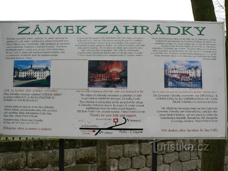 Mohutný zámek je dominantou obce Zahrádky na Českolipsku v Libereckém kraji. Zámek je dvoupatrový čtyřkřídlý objekt kolem čtvercového nádvoří, který je v rozích doplněn o kulaté věže, průčelí nad hlavním vchodem zdobí trojúhelníkový tympanon. V zámeckém interiéru je bohatě zdobený ústřední sál. Kolem zámku je rozsáhlý anglický park.