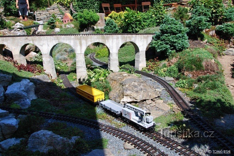 Soukromý model železnice na zahradě rodinného domu ve Střížově u Drahanovic. Po kolejích tu jezdí několik modelů vlaku v prostředí umělé krajiny s mosty a jezírky.