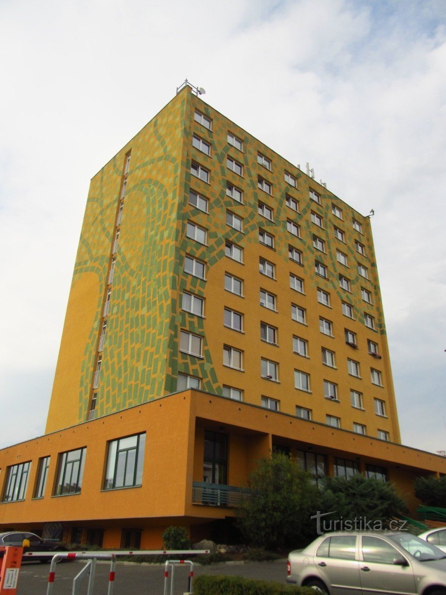 Zelený strom není skutečný strom, ale vysoká moderní budova stojící v centru Kadaně v těsném sousedství městské památkové rezervace.