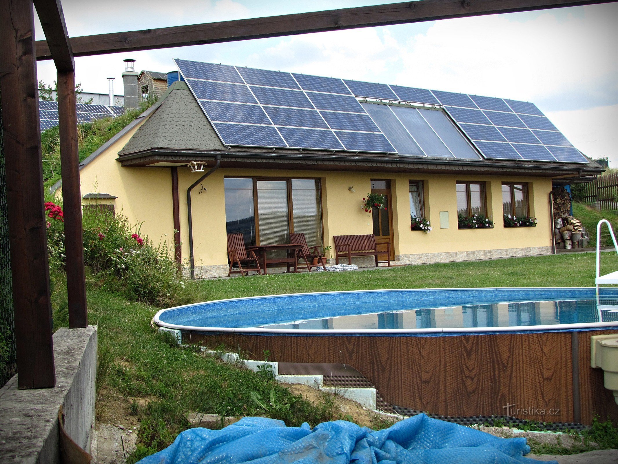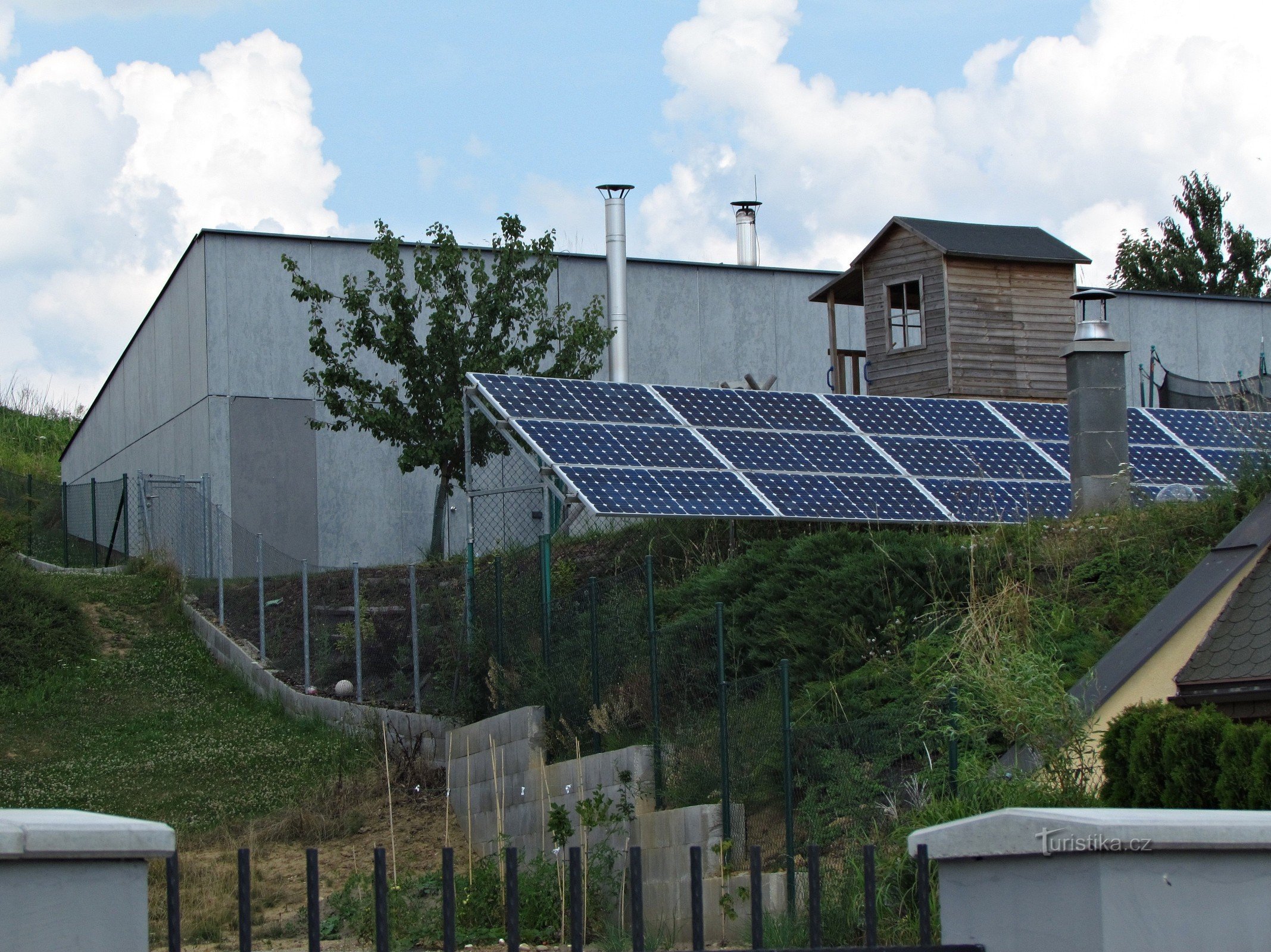 Při našem posledním výšlapu, kdy jsme ve strašném horku šotolinovým chodníkem vyšphali od Chlumských rybníků zalesněnou Strání vysoko na hřeben až na dohled prvních domů na Chlumu, zůstali jsme nad jejich podobou stát více než udiveni. Úžehem to být nemohlo - ale nám ty domy opravdu připadaly nějaké více jak podivné, skoro takové futurologické... Vysvětlení se nám dostalo z informačního panelu…