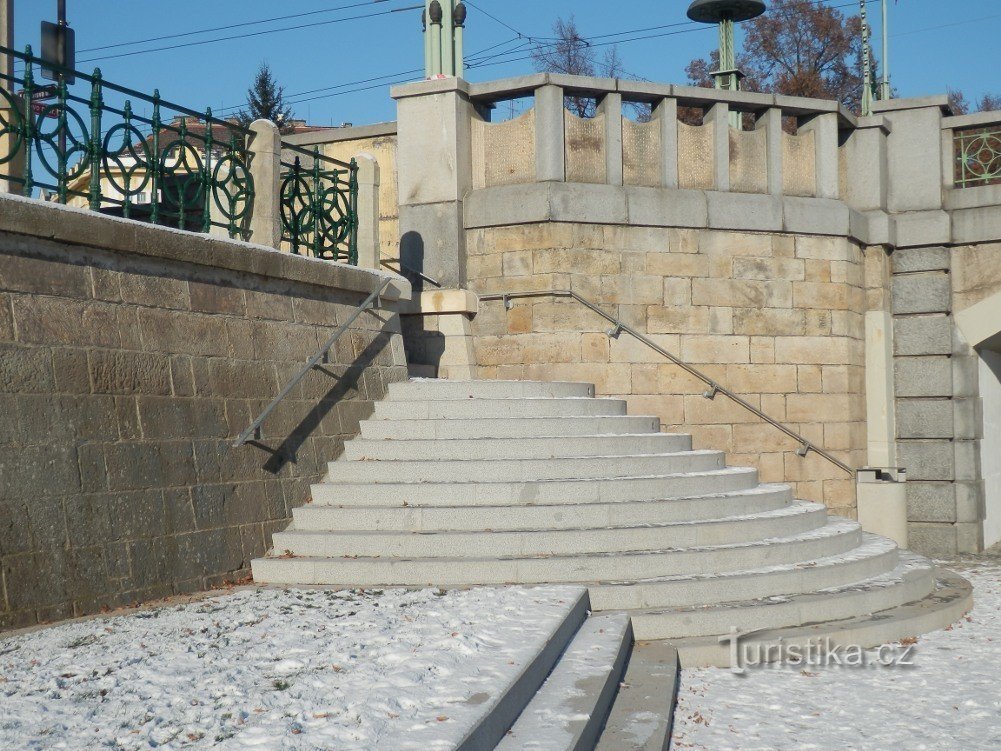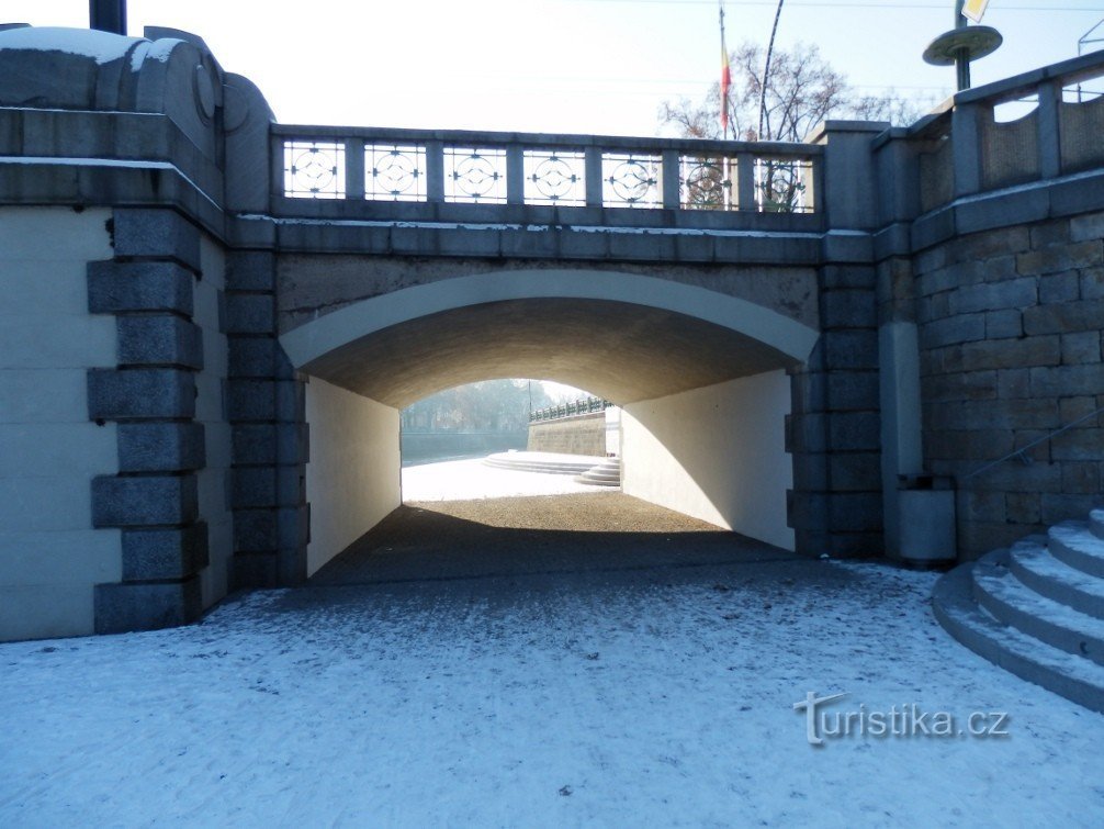 Náplavka podchází Tyršův i Pražský most.…