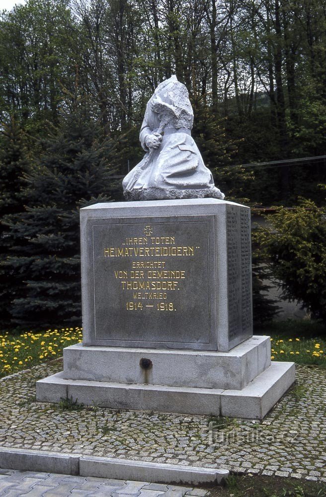 Přímo u budovu obecního úřadu v Domašově, což je dnes centrum spojených obcí, označených souhrnně Bělá pod Pradědem najdeme pomník obětem první světové války, nebo jak se tehdy říkalo Velké války. Když pomník odhalovali, doufalo se že žádná další podobná válka už nebude. Dnes už víme, že domněnky to byly mylné. Nakonec do dokazuje táhlý soupis v podstatě samých německých jmen na čelní a zadní…