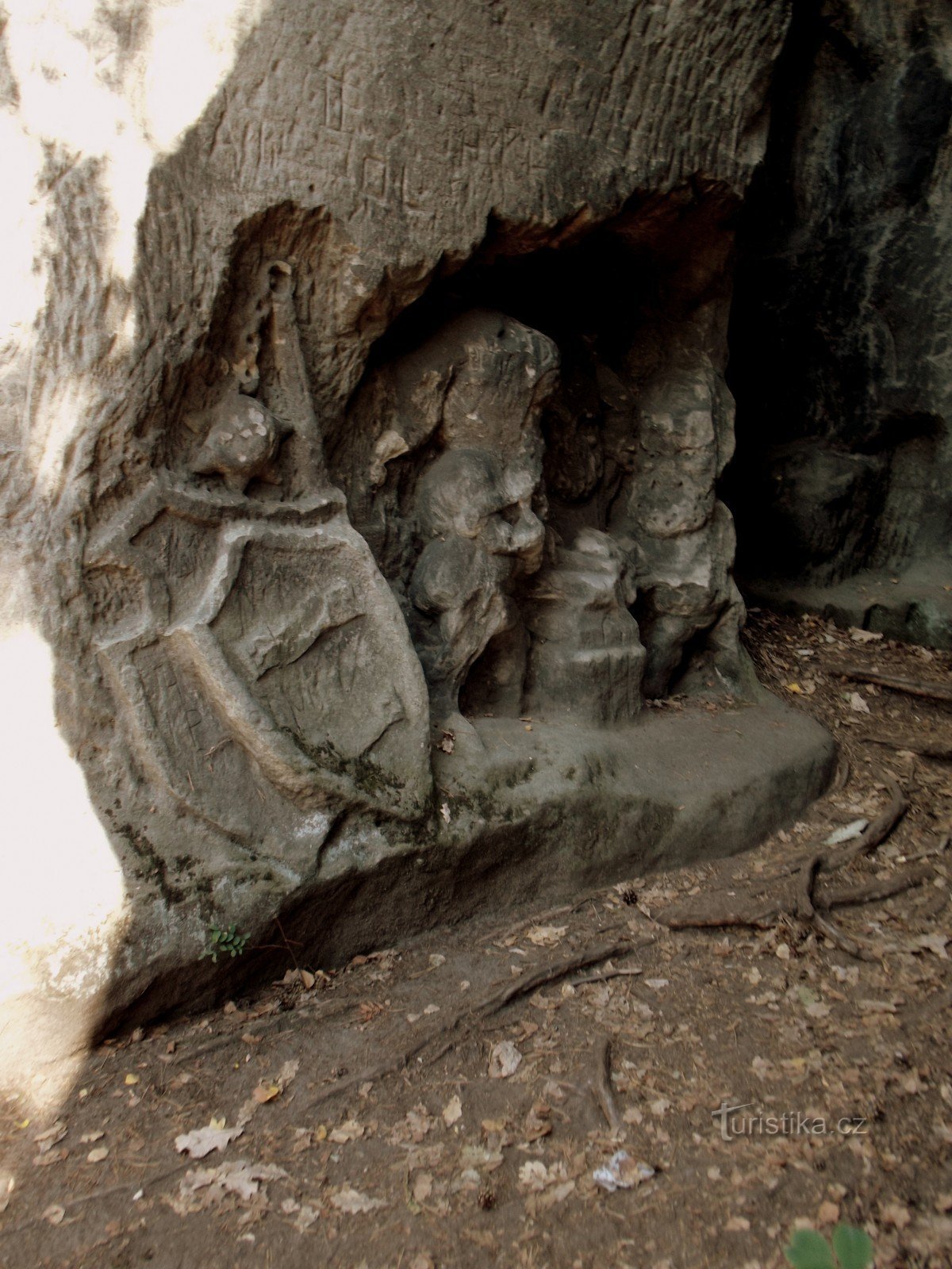 Prostor před jeskyní se nazývá Blaník a jsou zde vytesány postavy z českých dějin - Jan Žižka, Prokop Holý, spící vojsko a trpaslíci kovající zbraně. Na protější skále je vytesán kalich. Samotnou umělou jeskyni zdobí četné reliéfy postav z bajky Ferina a Lišák od F. M. Klácela, které…