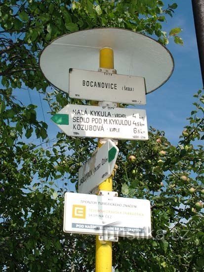 Orientační místo a rozcestí na zelené turistické značce v severní části obce Bocanovice. Nachází se na okraji obce v blízkosti místní školy. Jižním směrem vede zelená značka k železniční stanici, která je rovněž výchozím bodem zelené. Z rozcestí pokračujeme po zelené západním směrem přes vrcholky Malá Kyčera ( 744 m.n.m.) a Malá Kykula ( 788 m.n.m.) do sedla Pod Malou Kykulou a odtud dále…