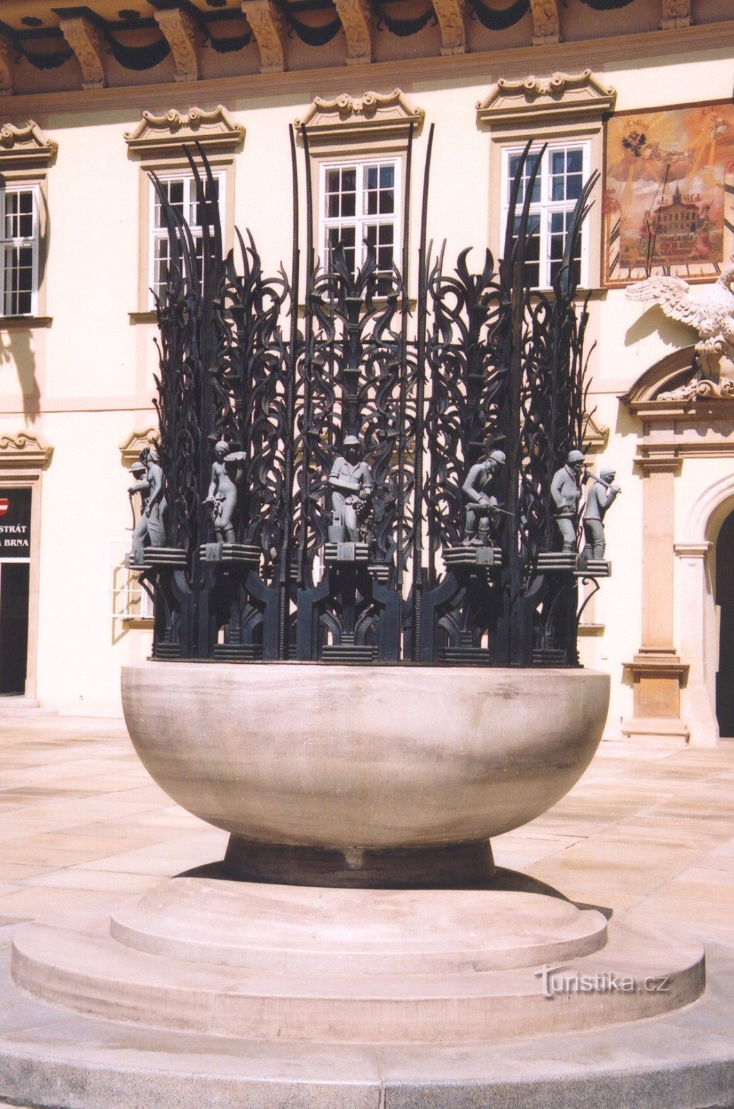 Uprostřed nádvoří Nové radnice se nachází dominantní kašna s kovanou mříží, zdobenou alegoriemi dvanácti měsíců, kterou navrhl J. Pešek a J. Stejskal. Byla zhotovena v roce 1928 jako jeden z exponátů pro brněnskou Výstavu soudobé kultury v Československu. Na nádvoří byla přenesena v roce 1935. V severozápadním koutě pod střechou nelze přehlédnout zajímavý chrlič vody z měděného plechu v podobě…
