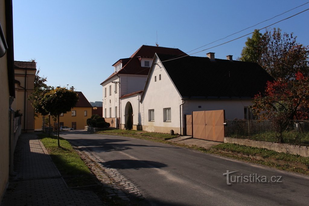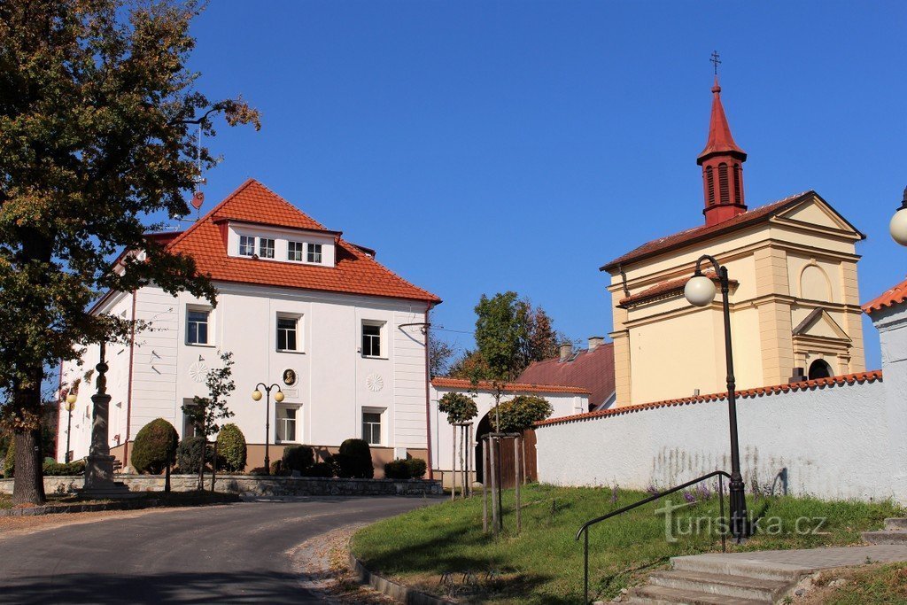 Obecní úřad sídlí v budově bývalé školy v horní části návsi. Jedná se o jednopatrovou stavbu. Ve stěně do silnice je deska a reliéf připomínající Josefa Jungmanna. Jaký byl jeho vztah k obci je tak trochu záhadou. Při zadní straně budovy je vjezd do dvora. Proti budově úřadu je budova hostince a pod starou lípou je kamenný kříž z roku 1868. V této části obce je při silnici do Vlkonic budova…