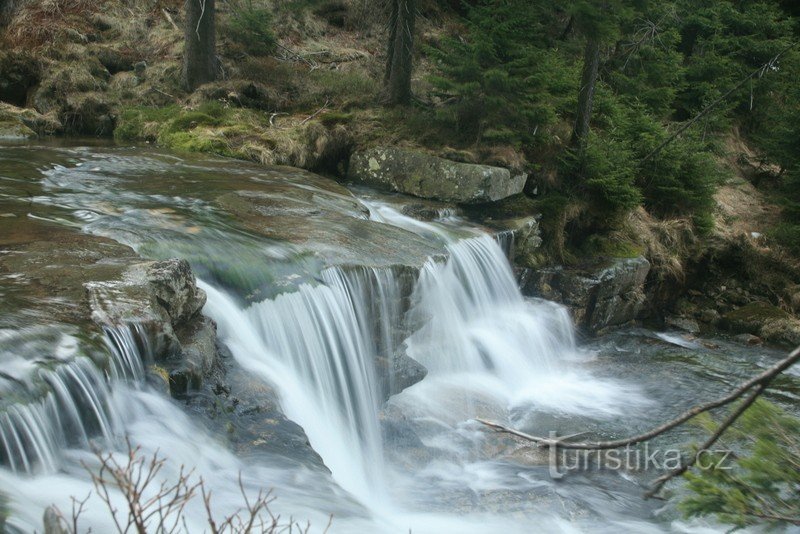 Krásný vodopád na Čertově strouze. Není sice moc vysoký (cca 2 m), ale díky velkému průtoku tak vypadá mohutně. K vodopádu je možno se dostat po pěšině vedoucí od žluté značky (serpentina) pokračováním proti proudu potoka cca 250 m.