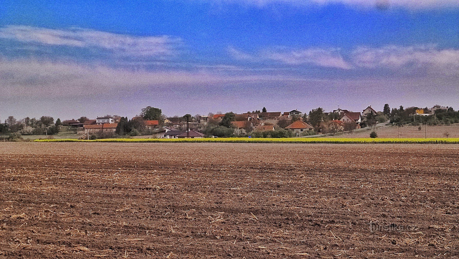 Je velikonoční víkend, scházíme po silnici od obecního úřadu Mokošín dolů z obce směrem na Lipoltice.