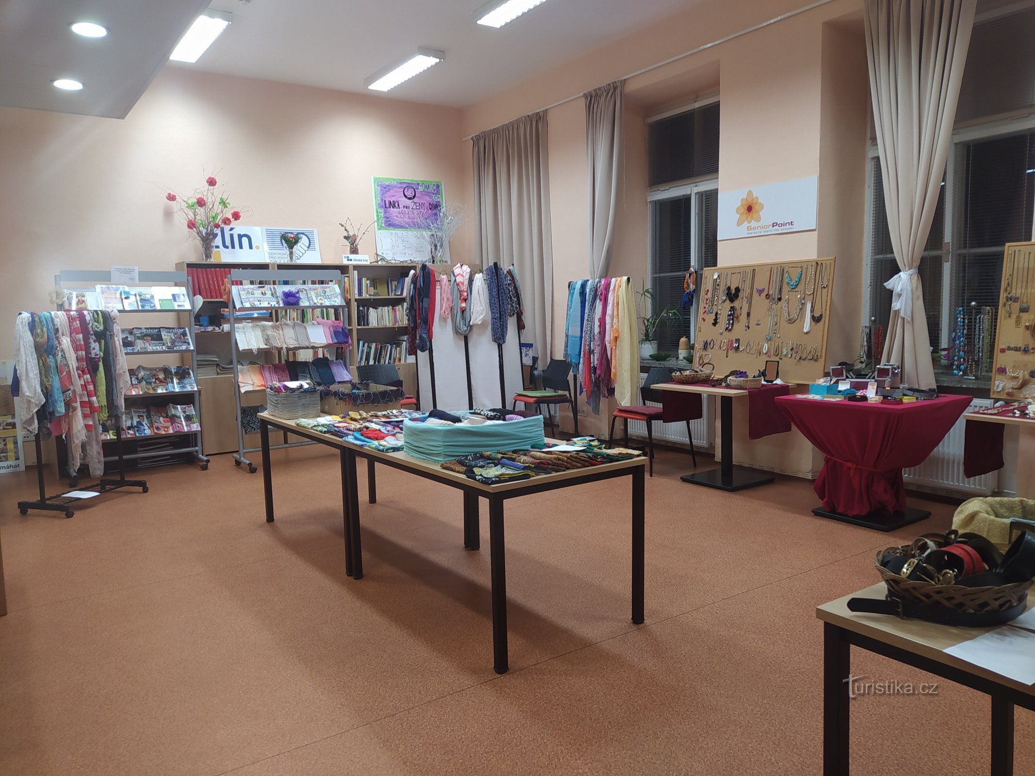 Šátkobraní poprvé - dobročinný prodej šátků, šál, bižuterie, kterou darovali příznivci Family a Senior Pointu Zlín (Zlínský klub 204, bývalá knihovna).Akce se konala v listopadu 2021.Zdroj: https://zlin.familypoint.cz/satkobrani-poprve-12-11-2021-v-10-17-hod/
