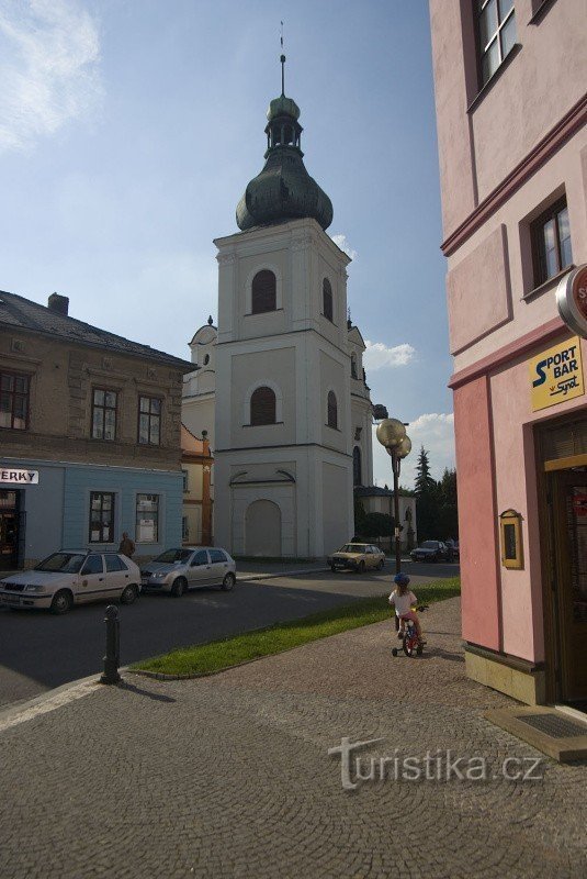 V městě býval dříve nejspíš dřevěný kostel, později snad částečně zděný, renesanční. Kostel však několikrát vyhořel (1602, 1659, 1725). Nový kostel byl vybudován v l. 1728-33. Orientovaná barokní stavba s hlavní podélnou lodí a vedlejší příčnou na půdorysu kříže. K presbytáři zezadu přiléhá osmiboká zákristie. Omítky s pilastry a římsami. Vnitřní valená klenba dosahuje 18m výšky. Na hlavním…