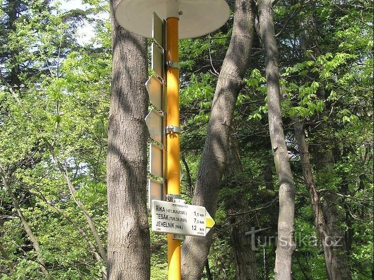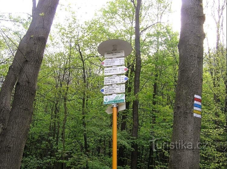 Rozcestí lesních cest na úpatí Svatého Hostýna. Červená, modrá a žlutá značka vedoucí od Bystřice pod Hostýnem - Lázní se zde rozděluje. Červená s modrou spolu ještě 500m pokračují na rozcestí Pod Vodní kaplí kde červená uhýbá na Hostýn, zatímco modrá pokračuje k rozcestí Pod valy a na Skalný. Žlutá zde odbočuje k hotelu do osady Říka.