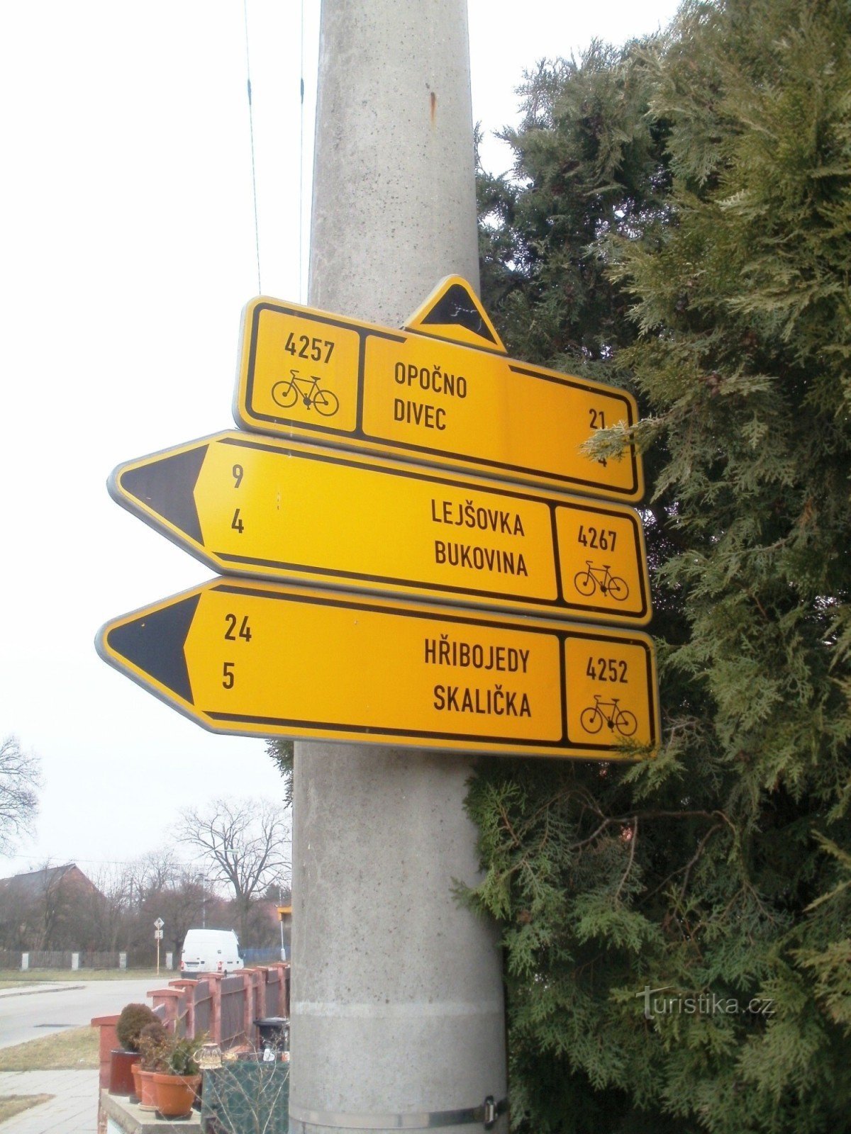 Cykloturistický rozcestník, který se nachází na návsi u točny MHD v Pileticích, ukazuje cykloturistům cestu po trasách č. 4252 ve směru na Hřibojedy, č. 4267 ve směru na Lejšovku, č. 4257 na Opočno a cestu k Braunovu betlému.