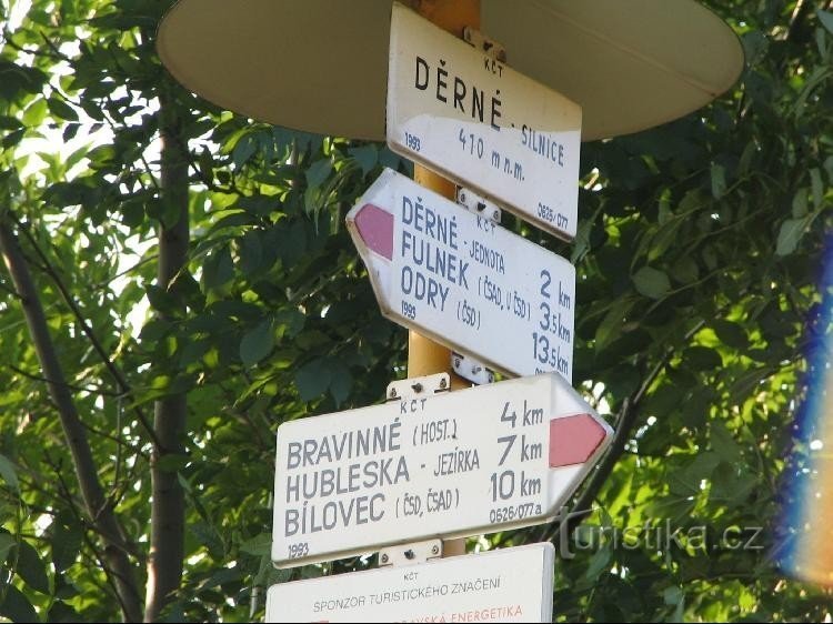 Děrné - silnice je rozcestí a orientační místo na červené turistické trase a najdeme jej severním směrem od osady Děrné. Rozcestník je umístěn na sloupku na okraji lesa v místech kdy červená turistická trasa vedoucí z města Fulnek opouští silnici spojující město Fulnek a obec Skřipov a dále pokračuje po lesní cestě. Červená značka dále vede přes obec Bravinné a kolem jezírka Hubleska do města…