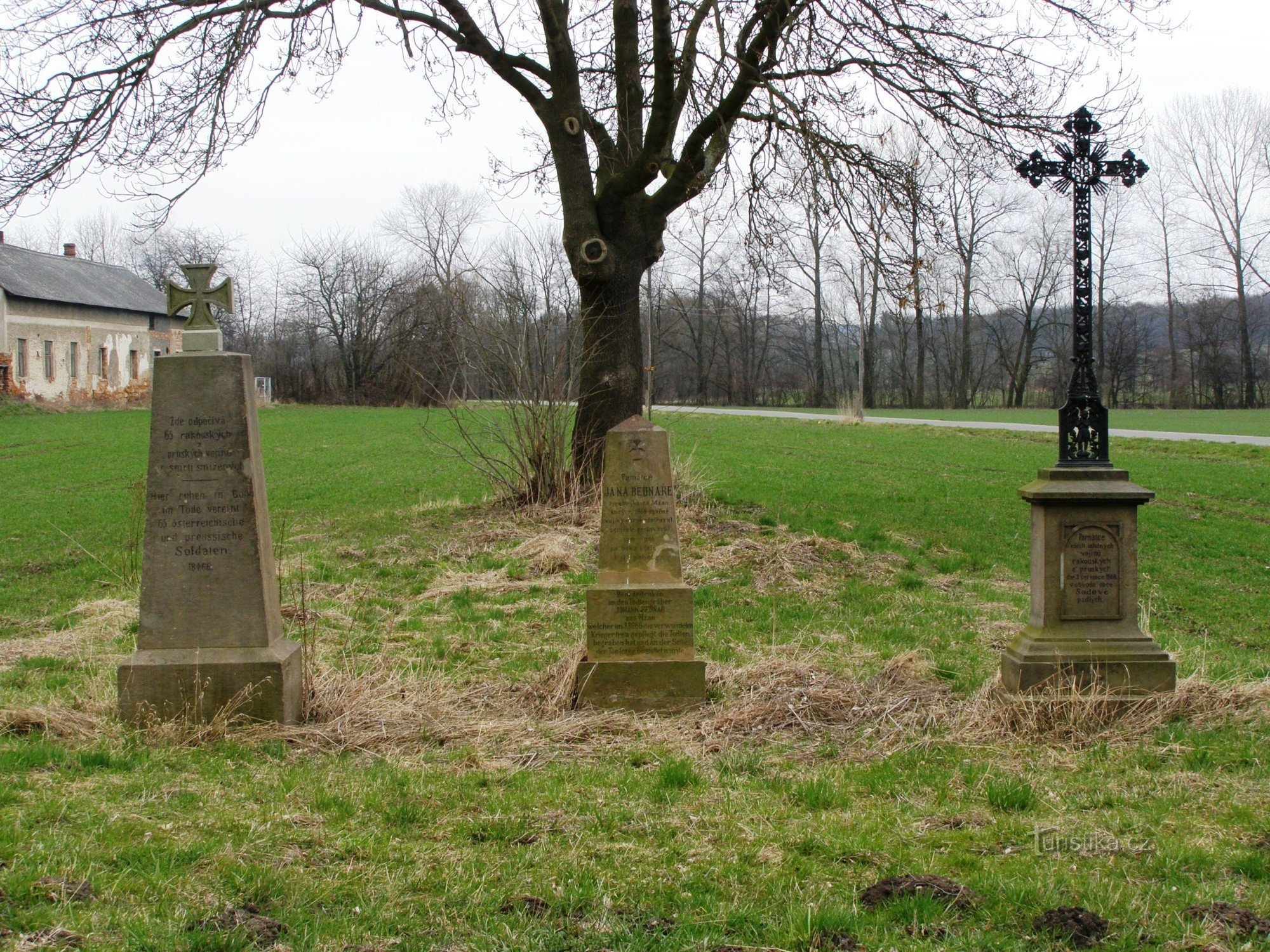 Soubor pomníků obětí prusko-rakouské války roku 1866 najdeme na konci obce při cestě k Sadové. Jedná se o pískovcovou pyramidu věnovanou 65 rakouským a pruským vojákům, pomník Jana Bednáře, hrobníka ze Mžan, který obětavě ošetřoval zraněné a pomník všeobecného věnování (s ozdobným křížem).