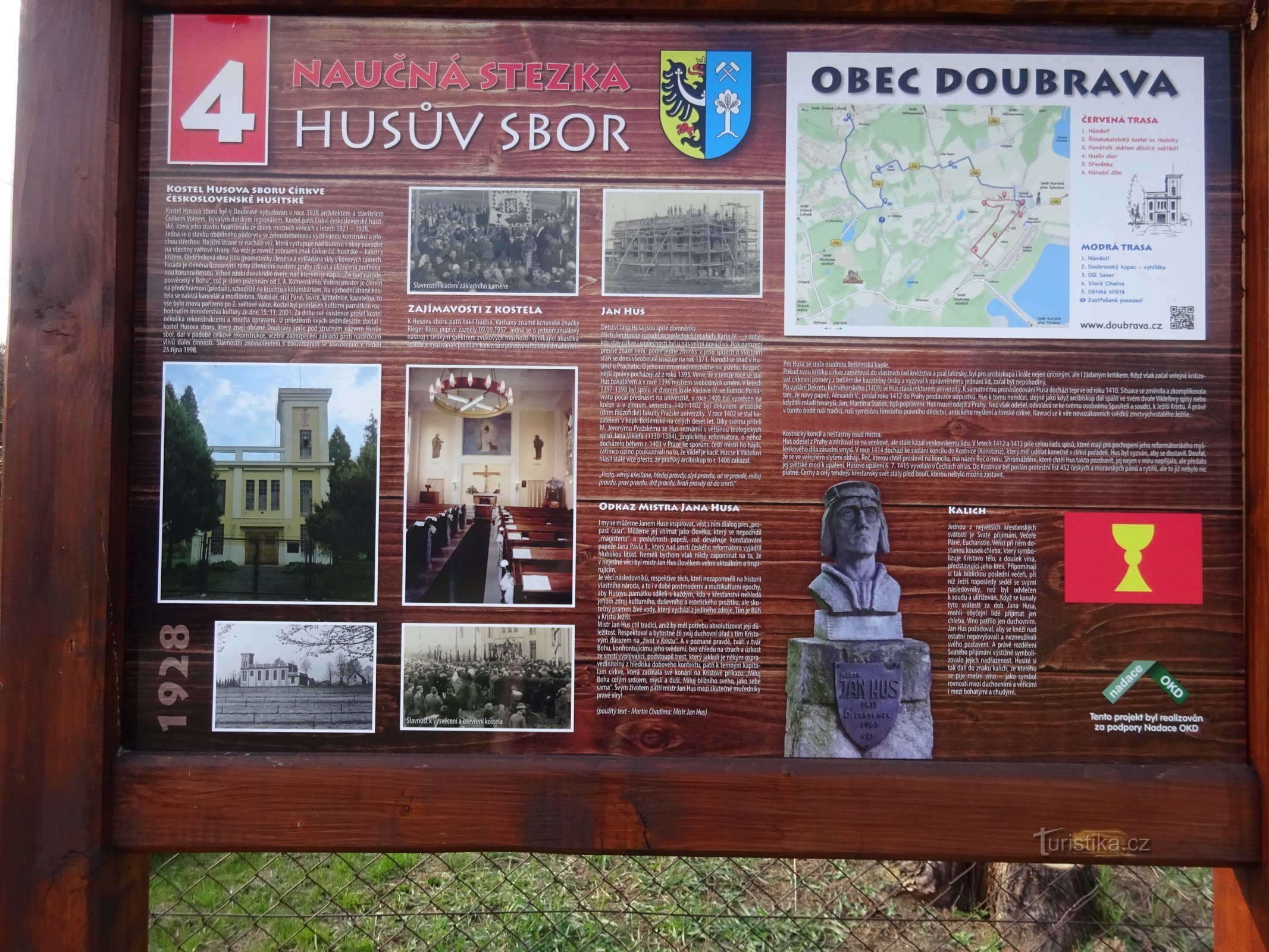 Čtvrtým zastavením na červené trase Naučné stezky v Doubravě je Husův sbor. Kostel Husova sboru církve československé husitské byl postaven architektem, stavitelem a bývalým italským legionářem Čeňkem Volným v r. 1928. Místní věřící se na stavbu kostela skládali celých osm let 1921 - 1928. Na kostelní věži je zobrazen znak husitské církve - kalich s křížem. Nad vchodem do kostela je nápis, jsou…