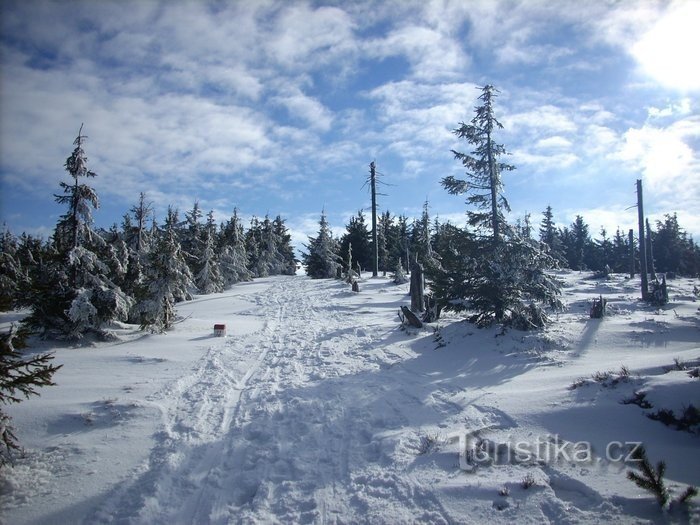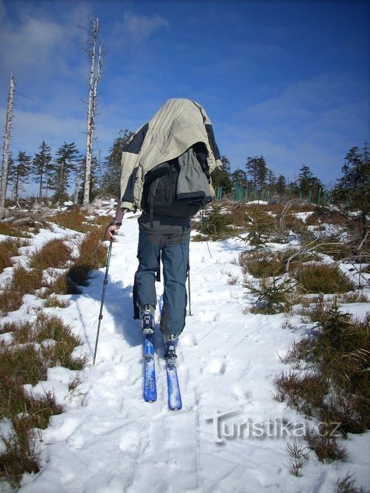 Na parkovišti ve Velké Moravě neletí na záda jen batoh, ale i lyže a my si to volnou chůzí šineme po asfaltce zpět do Horní Moravy, kde modrá značka konečně uhýbá z hlavní cesty. Za mostkem cesta začíná pěkně prudce stoupat…