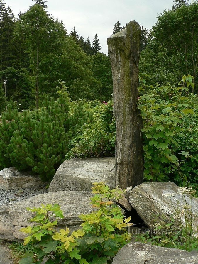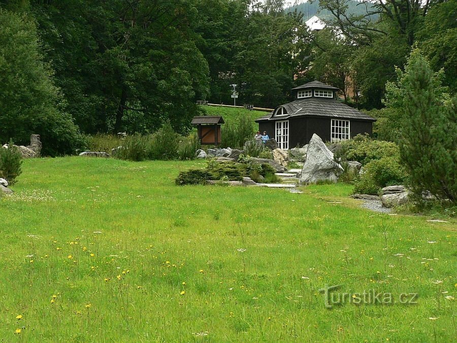 Při vjezdu do Karlovy Studánky směrem od Malé Morávky narazíme po levé straně na geopark seznamující návštěvníky s horninami vyskytujícími se v Hrubém Jeseníku. Raritou je upozornění pokladní, že na kamenech se často vyhřívají zmije :o)).