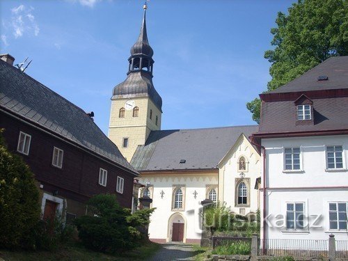Kostel sv.Jiří je dominantou nad náměstím ve Chřibské.Byl původně dřevěný a v r.1596 byl goticky přestavěn na kamenný.R.1649 byly provedeny další úpravy a později byla zvýšena i věž kostela.