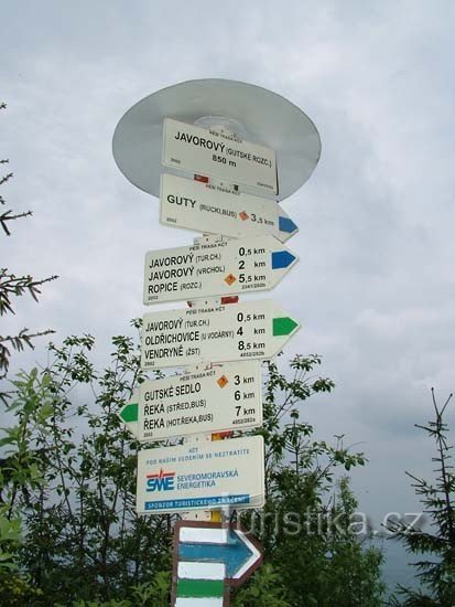 Rozcestí Gutské sedlo - Javorový se nachází 500 metrů od turistické chaty Javorový vrch. Vrchol Javorový ( 1031 m.n.m.) se zvedá jihozápadním směrem od tohoto rozcestí. Procházejí tudy dvě turistické trasy a to modrá a zelená značka. Východním směrem vedou obě značky společně na rozcestí Javorový - turistická chata. Zelená odtud dále pokračuje do obce Oldřichovice a po modré pokračujeme na vrchol…