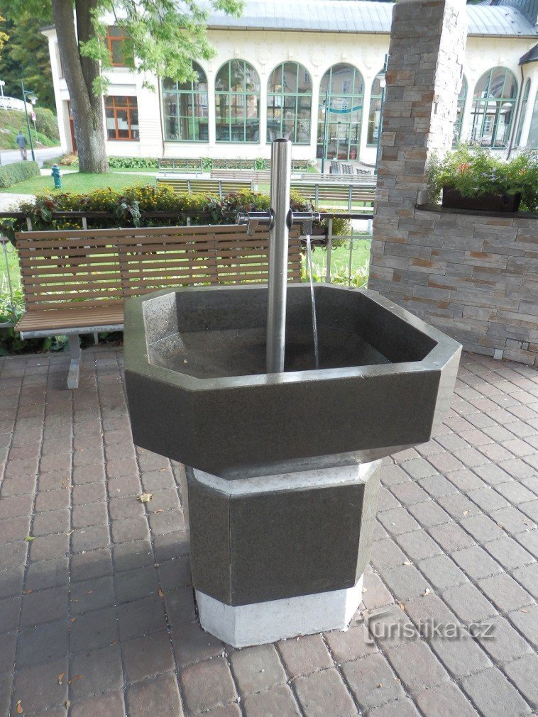 Přímo zde se však žádný pramen nenachází. Vyvěrající minerální voda je sem přivedena potrubím z…