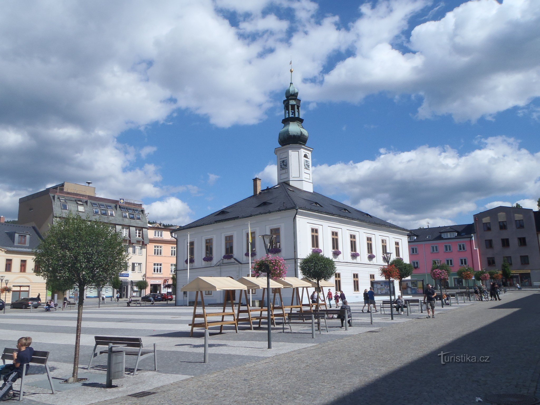 Masarykovo náměstí je opravdu centrem Jeseníku. Odtud je 1,5 kilometrů k vlakovému a asi 500 metrů k autobusovému nádraží.