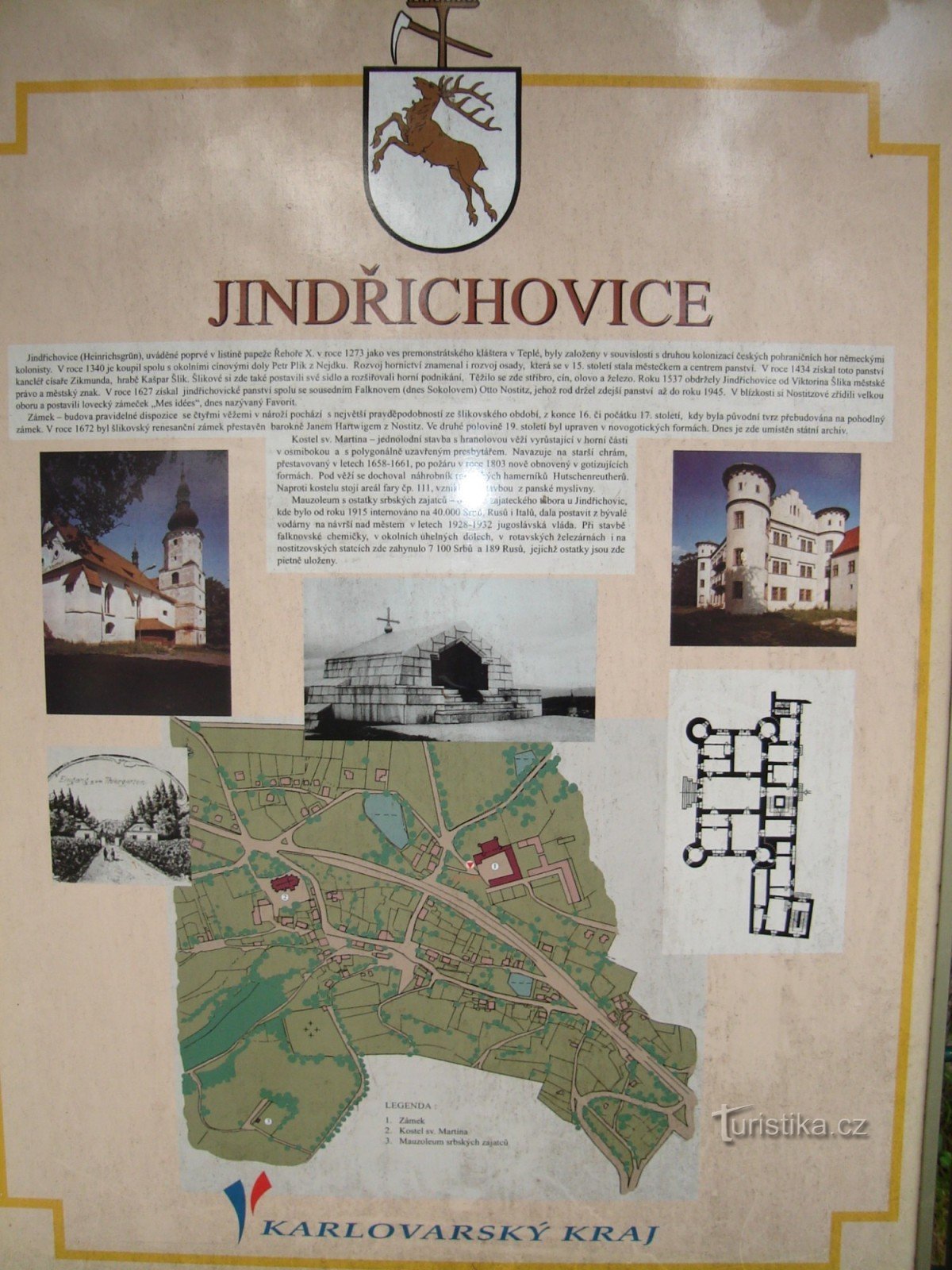 Jindřichovice se nacházejí asi 18km od Sokolova. První písemná zmínka pochází z roku 1273 v listině papeže Řehoře X. Tehdy obec patřila k panství kláštera v Teplé. Historie obce je spjata s těžbou cínu v okolí.V obci se nachází zámek z roku 1672. Tento barokní zámek byl ve 2.polovině 19.stol pseudogoticky upraven. Poblíž dnešního vchodu je do stěny zazděn plastický reliéf s motivemsv.Jiří v raně…