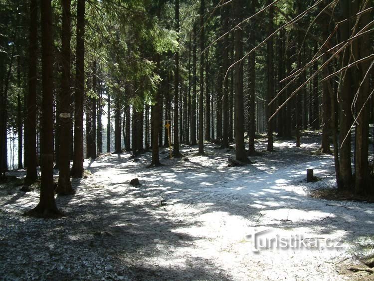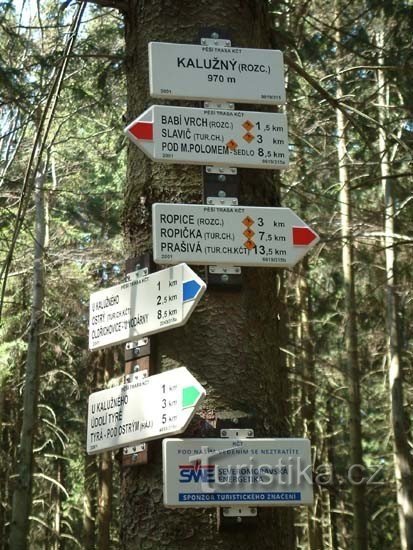 Rozcestí Kalužný najdeme severním směrem od stejnojmenného vrcholku Kalužný vrch ( 993 m.n.m.), který se zvedá severovýchodním směrem od horské rekreační osady Kamenitý. Toto rozcestí je v oblasti lesa a tvoří jej křižovatka tří turistických tras a značené cyklostezky. Rozcestím prochází červená značka vedoucí z vrcholku Malá Prašivá ( 706 m.nm.m.) přes Ropičku ( 918 m.n.m.) a Velký Lipový ( 1003…