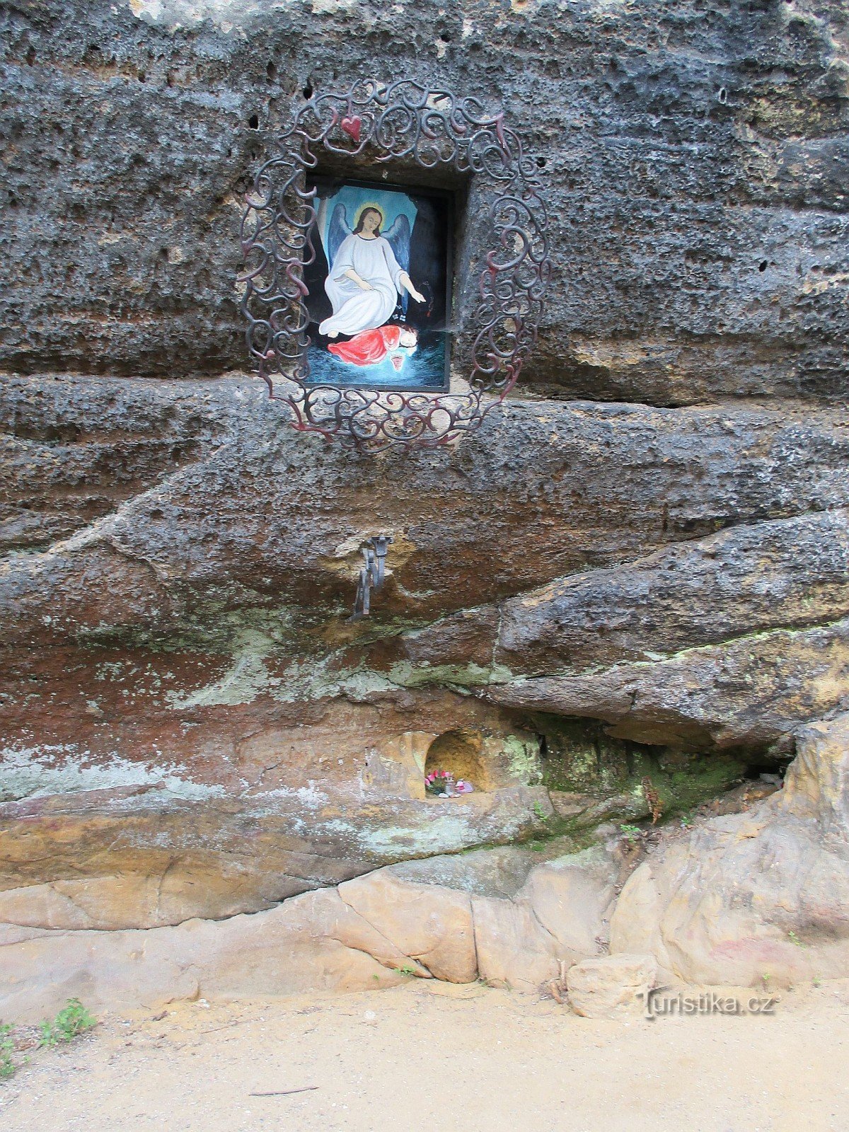 Poutní zastavení u kamenickošenovského sídliště Pískovec I. je na skále namalovaný obrázek anděla strážného bdícího nad spícím dítětem. Zdobený je kovanou mříží. Pod ním je kovaný svícen a ještě nížeji je ve skále vytesaná malá nika. Bohužel podrobnější informace se mi nepodařilo získat.