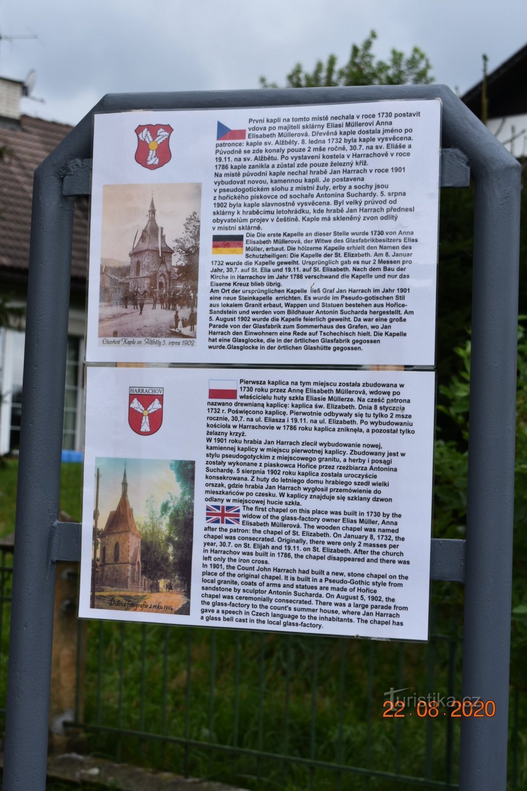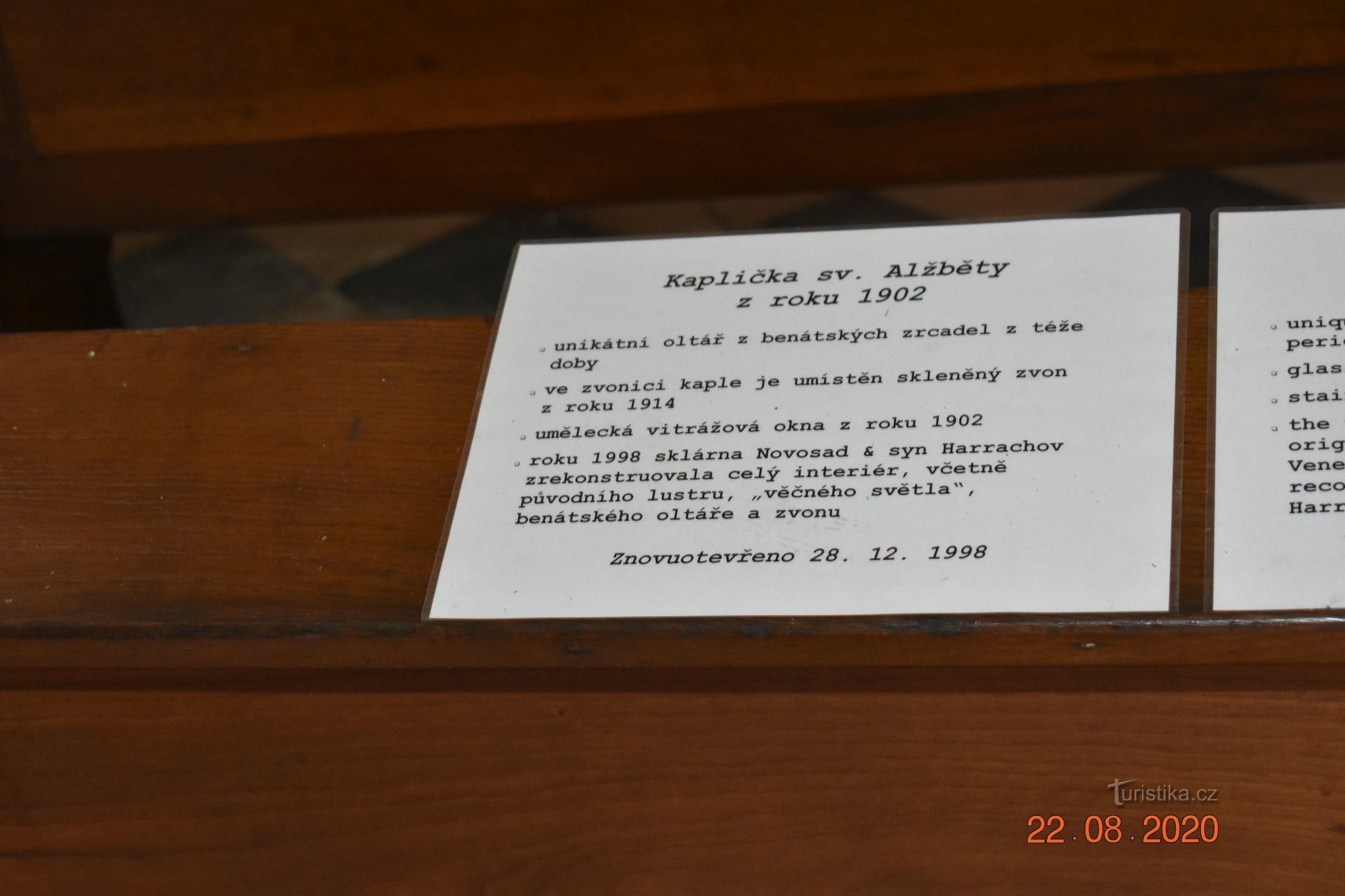 Kaple svaté Alžběty (Harrachov) 22.8.2020 Kaple St. Elizabeth, tak psáno na recenzích mapy google Krásná zpřístupněná kaple. Nachází se v blízkosti harrachovských skláren, tudíž nepřekvapí skleněný zvon vysoký 50 cm a vážící 10kg a barevná vitrážová okna (z r. 1901). Novogotická kaple patřící městu.