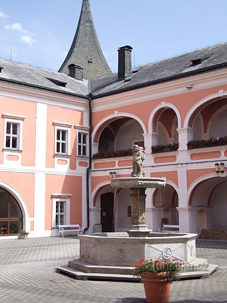 Kašna s plastikou sokolníka