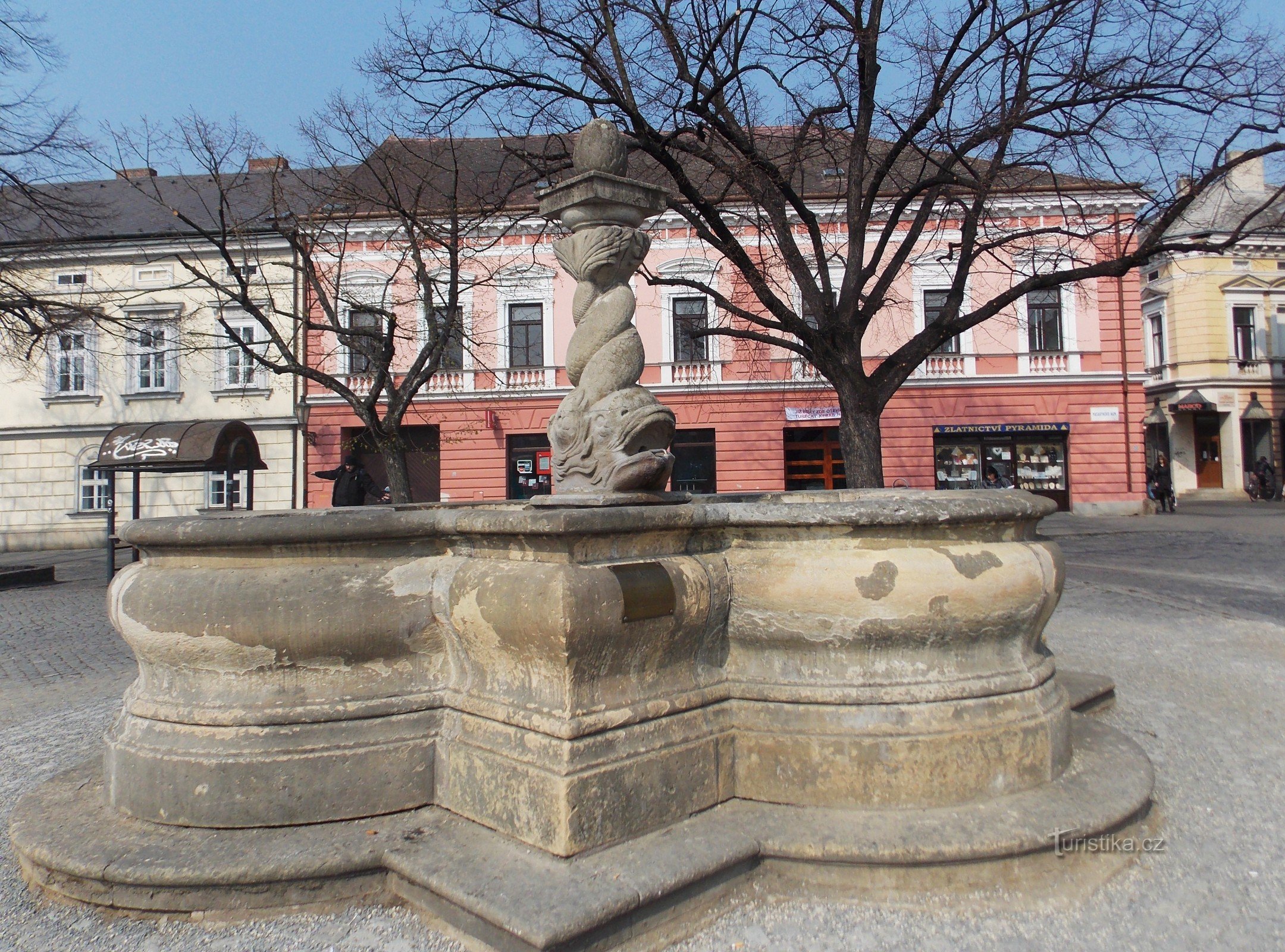 Okresní královské město Uh. Hradiště ve Slováckém regionu, ležící na levém břehu řeky Moravy zkrášluje spousta historických památkek, ale také tři kašny. První zdobí hlavní - Masarykovo náměstí na jižní straně, kde ji spatříte naproti Lékárny U Zlaté koruny. Tato barokní kašna z 1. pol. 18. stol. je zajímavá plastikou delfínů a piniovou šiškou.