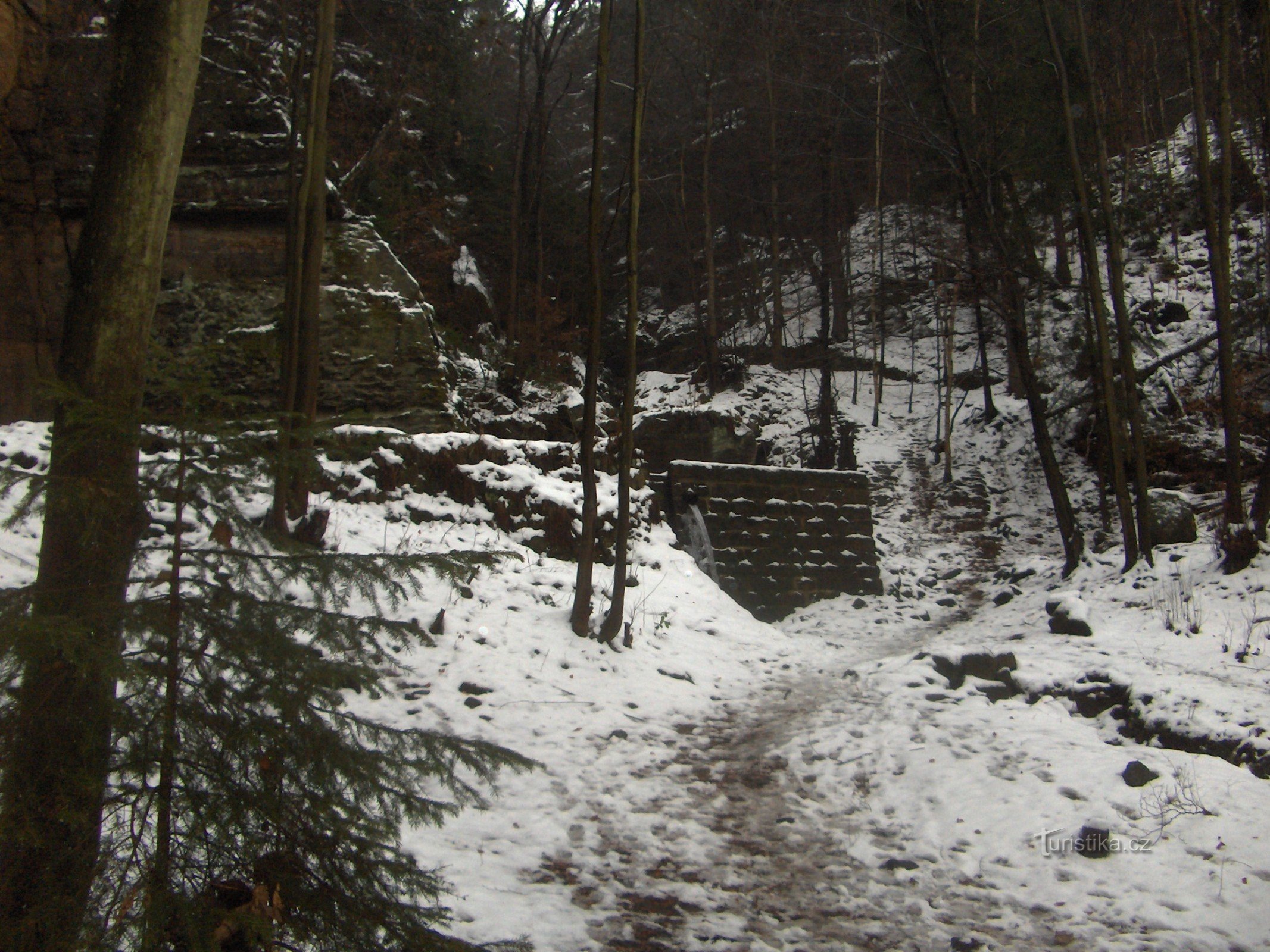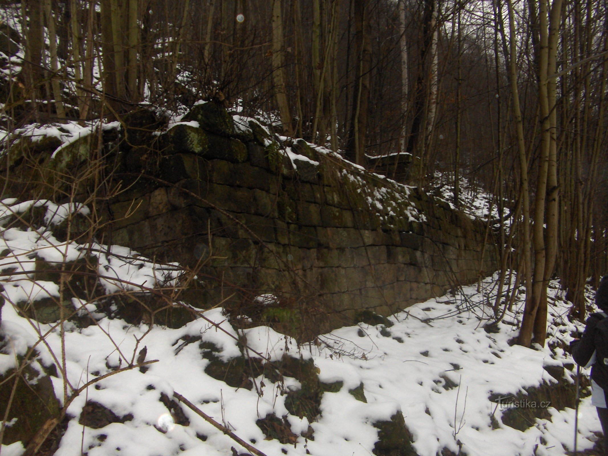 Za nádražní budovou jsme odbočili Doprava mezi domy. Pískovcovými bloky dlážděná cesta mířila do zalesněného svahu. Okolo cesty se objevovaly ruiny domů dřívější části Dolního Žlebu…