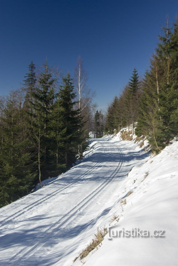 Netradiční trasa pod částí hlavního hřebene Hrubého Jeseníku. Doporučuji spíš běžkařům turistům a větší skupině – je možné, že si stopu budou muset lyžaři udělat sami. Nástup na trasu je u rozcestníku nad Klepáčovem u silnice č. 11, můžeme sem dojet třebas od skřítku podél svodidel, nebo od autobusové zastávky Klepáčov -myslivna. Najdeme tu rozcestníky Cyklotrasy zelené č. 6189 a k tomu i…