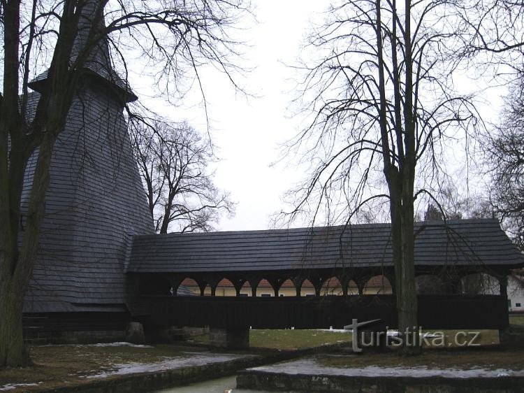 Spolu s dřevěnou zvonicí a krytým mostem tvoří památkově chráněný objekt. Nachází na vyvýšeném místě, které je kolem dokola obehnáno mokřinami.