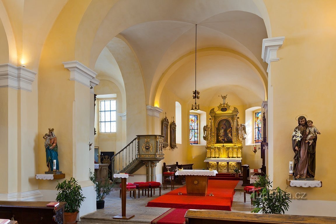 Na dřevěných lavicích se nachází dvojí provedení rodových znaků Vratislavů z Mitrovic a manželky Kocové z Dobrše, pocházející přibližně z období po r. 1690. Na kazatelně jsou tytéž znaky v barevném provedení. Stále je také používána barokní křtitelnice s cyklem maleb ze života sv. Jana Křtitele.Ve výklenku na východní straně stavby stojí socha sv. Floriána, ochránce před ohněm a dalšími živly.Na…